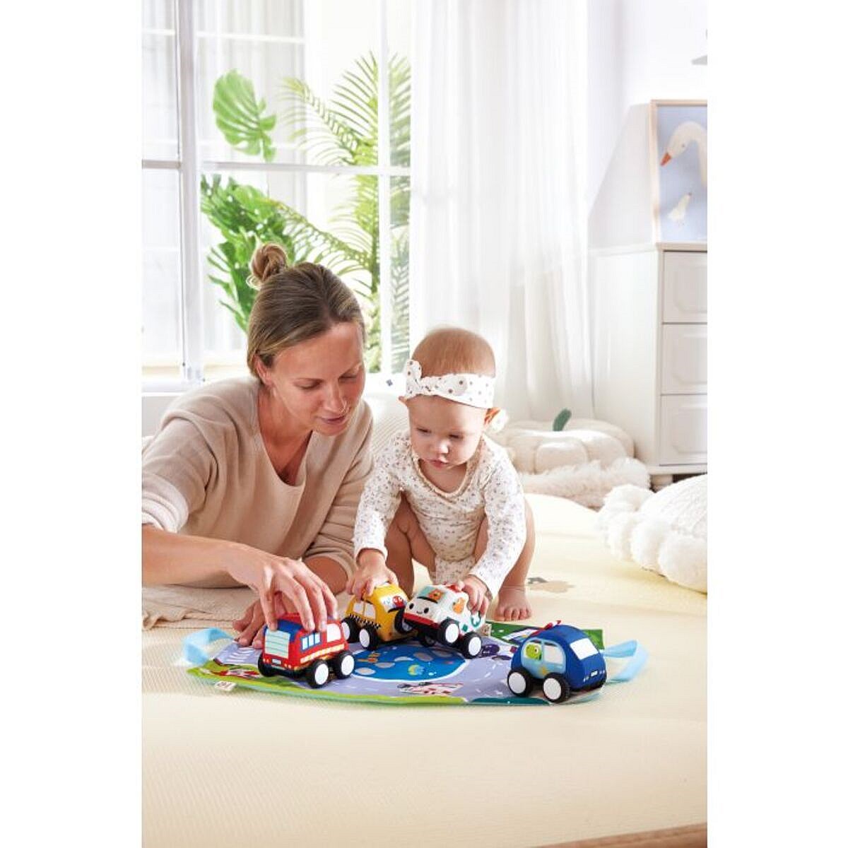 Enjoy endless adventures with these pull-back cars that are also super-soft. Perfect for little motorists to enjoy hours of imaginative play. Encourage children to create stories about the fire truck rescuing people or the ambulance rushing to help.This set can enhance your child`s imagination, creativity, and hand-eye coordination. 4 PULL-BACK CARS: This pull-back car set includes four different vehicles a fire truck, ambulance, police car, and taxiu2014each adorned with animal images, helping children recognise various animals and boost cognitive skills. SAFE & SILENT DESIGN: Made from soft plush material, these pull-back cars are comfortable to handle and safe for play. They're also designed to stay quiet, even when bumping into objects DURABLE & RACE-READY: Simply pull back on a flat surface and release to see the cars zoom forward! The sturdy wheels ensure lasting enjoyment, perfect for independent play or parent-child interaction.MULTIFUNCTIONAL STORAGE BAG: The included storage bag doubles as a play mat, keeping vehicles organised after play and adding an extra dimension to playtime. SKILLS DEVELOPMENT: Bright colours on each vehicle and the bag promote colour recognition, while gripping and rolling the cars encourage fine motor skill development, making playtime both entertaining and educational