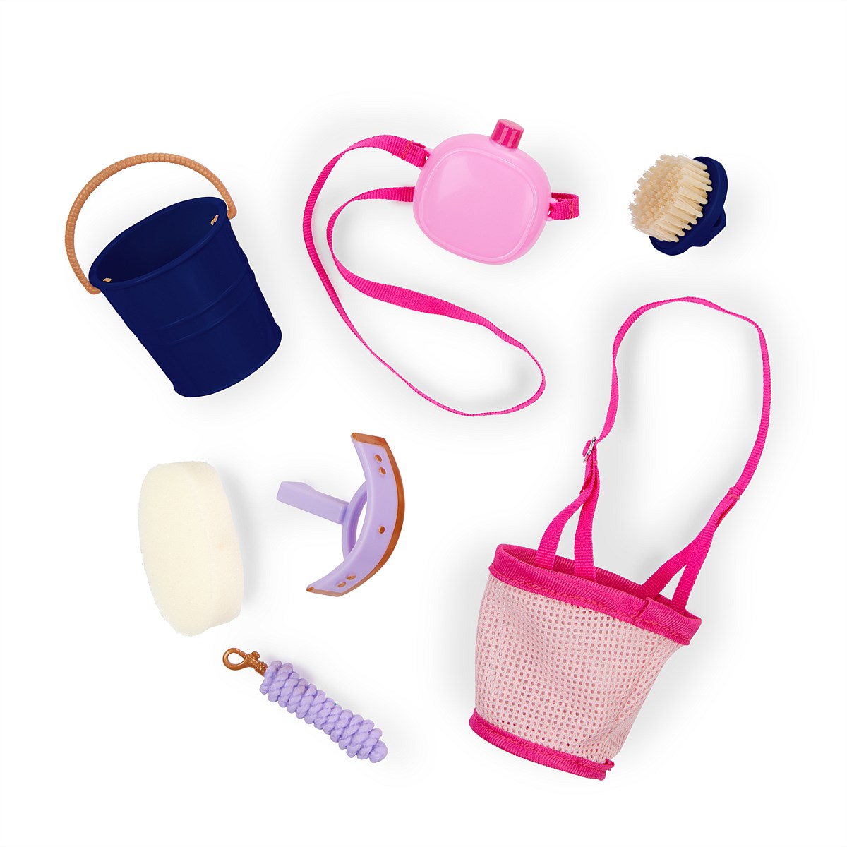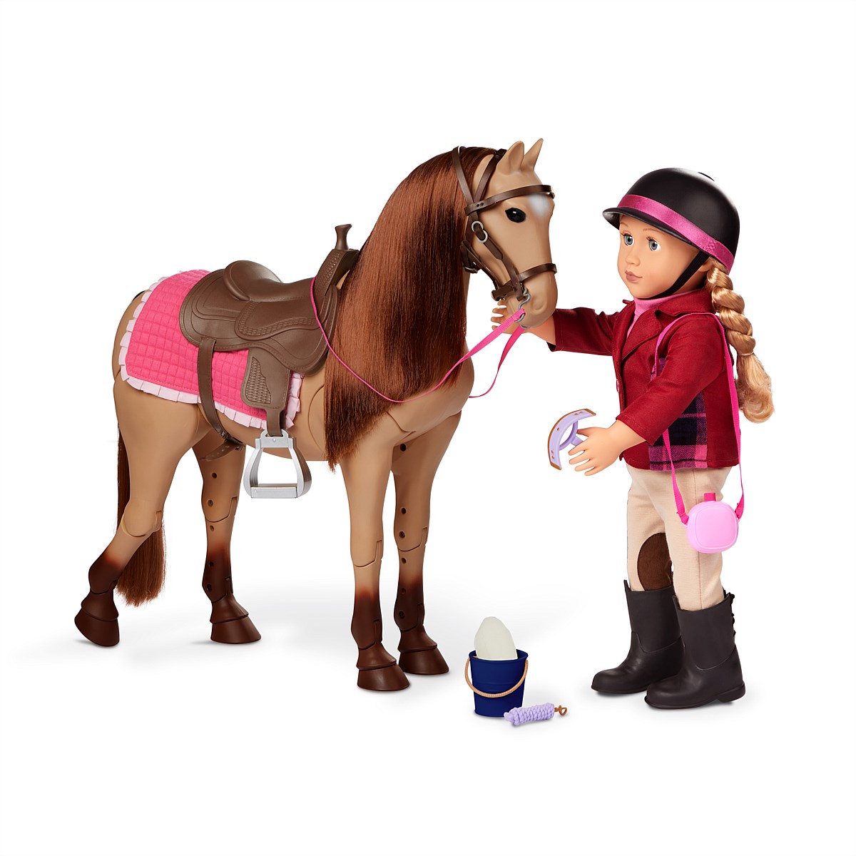 Saddle up with this beautiful and elegant posable horse named Morgan from the Our Generation Poseable Horse collection. Morgan is a perfect companion for your favorite 18-inch dolls especially if she loves anything equestrian. Morgan has that long, silky, dark-brown mane and tail that are great for brushing and styling. She also has poseable feet that allow Morgan to stomp and pose. Get Morgan ready for a great day of prancing and dancing on the fields. Use the bridle and reins to guide your horse wherever you go and always keep Morgan fed with a bag of feeds. On rest days, Morgan deserves a day of pampering. Care for your horse using some grooming tools like brush, spray, sponge, and more.