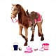 This OG Posable Horses collection includes a posable horse, saddle, bridle, reins, brush, blanket, trophy, sponge, cup, a bucket, spray bottle, ribbon, certificate, and trail map.