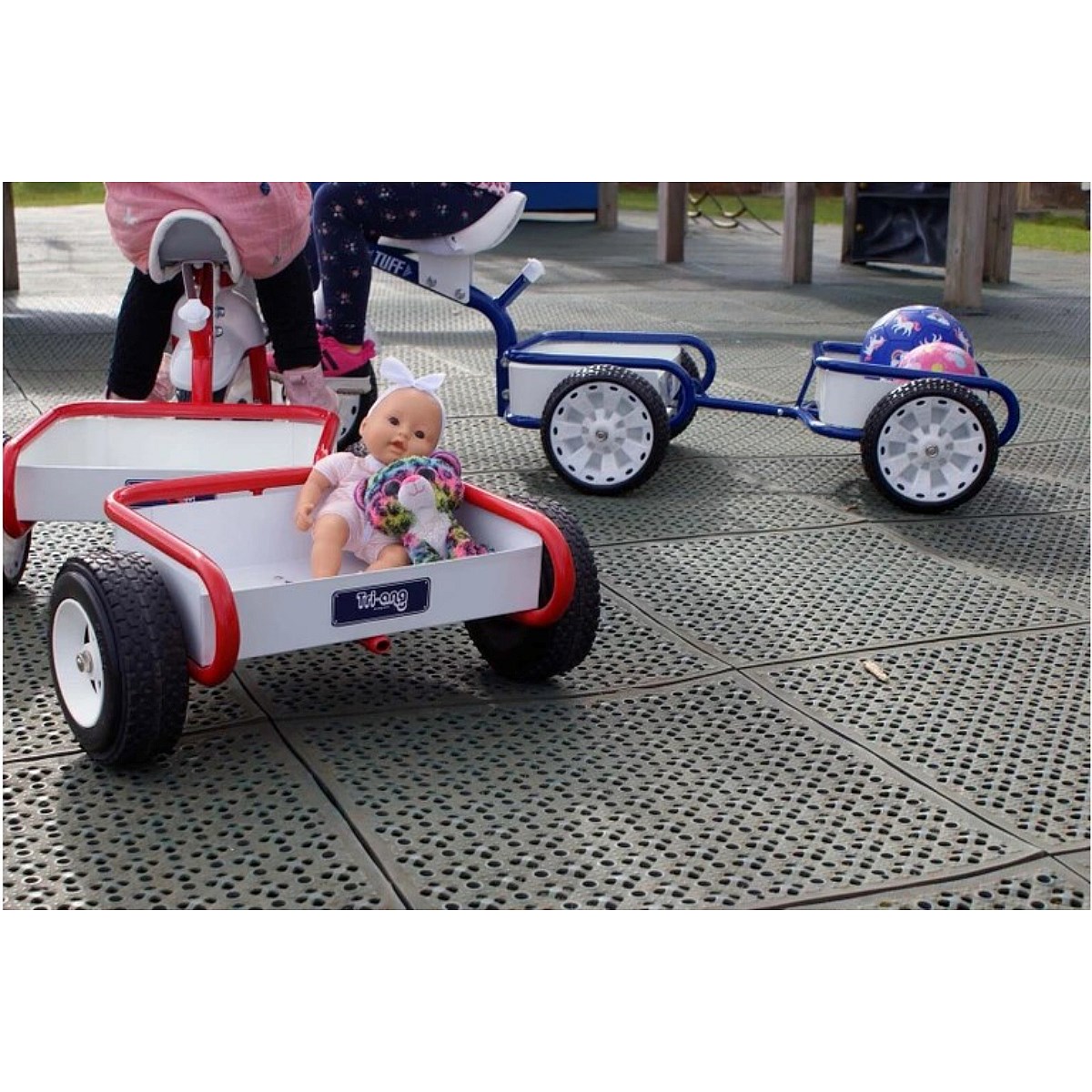 A specially designed metal trailer made of steel that attaches to the Tuff Trike. The trailer comes with a hook to attach to the back of the trike, which also doubles as a hanging hook saving you on floor space by hanging it on the wall.