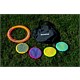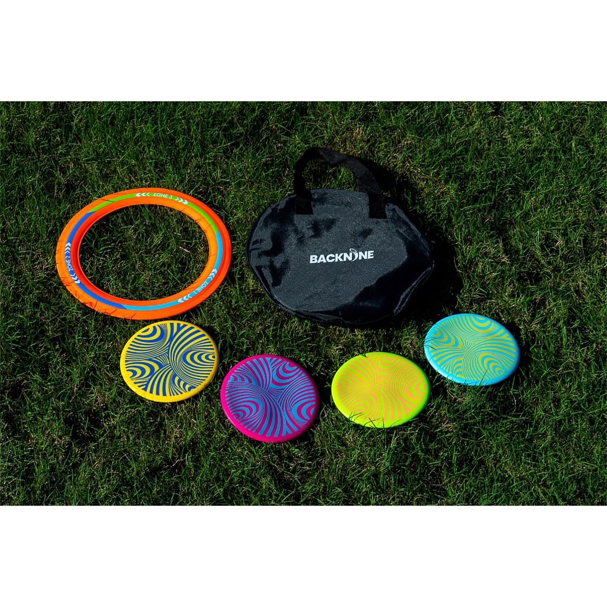 reate your own disc course anywhere with Backnine from Waboba! Set includes 1 Flying Target Ring, and 4 Waboba Wingman discs. Throw the ring to set the course challenge! Then throw your Wingman disc to land on or in the Ring in the least amount of throws. For added fun, create rules when a disc lands in a Zone on the Ring! Scorecard included.