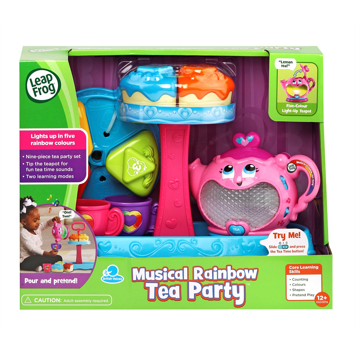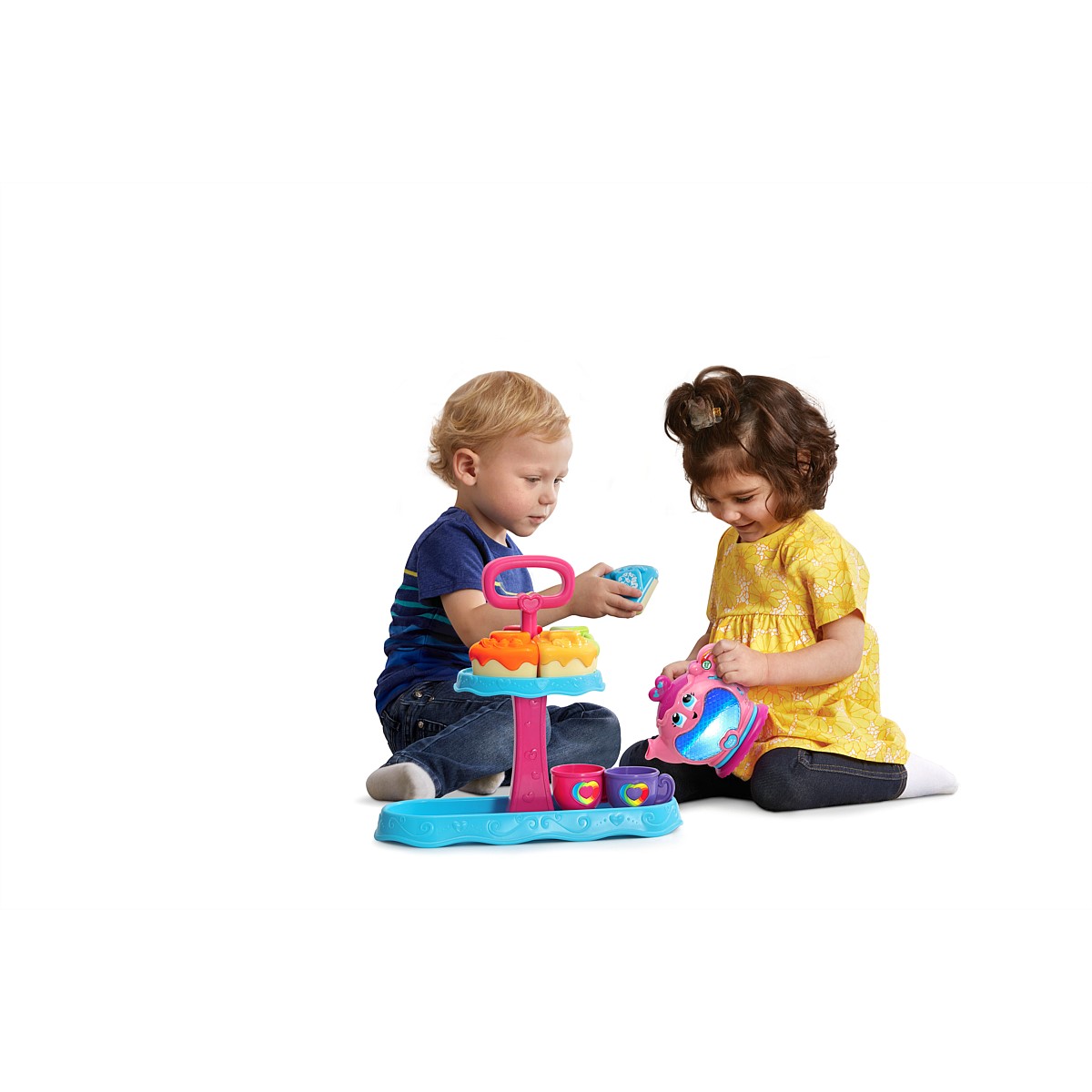 Brew up learning fun with this pretend play teapot that teaches colours, counting, matching, manners and more. Musical teapot, cake stand, 5 pieces of cake and two cups provide the perfect party to explore pretend play. Music and tea party modes provide a fun range of activities that introduce colours, shapes, numbers and sharing. "Tea"lights up inside the pot, tilts when poured and disappears when empty.