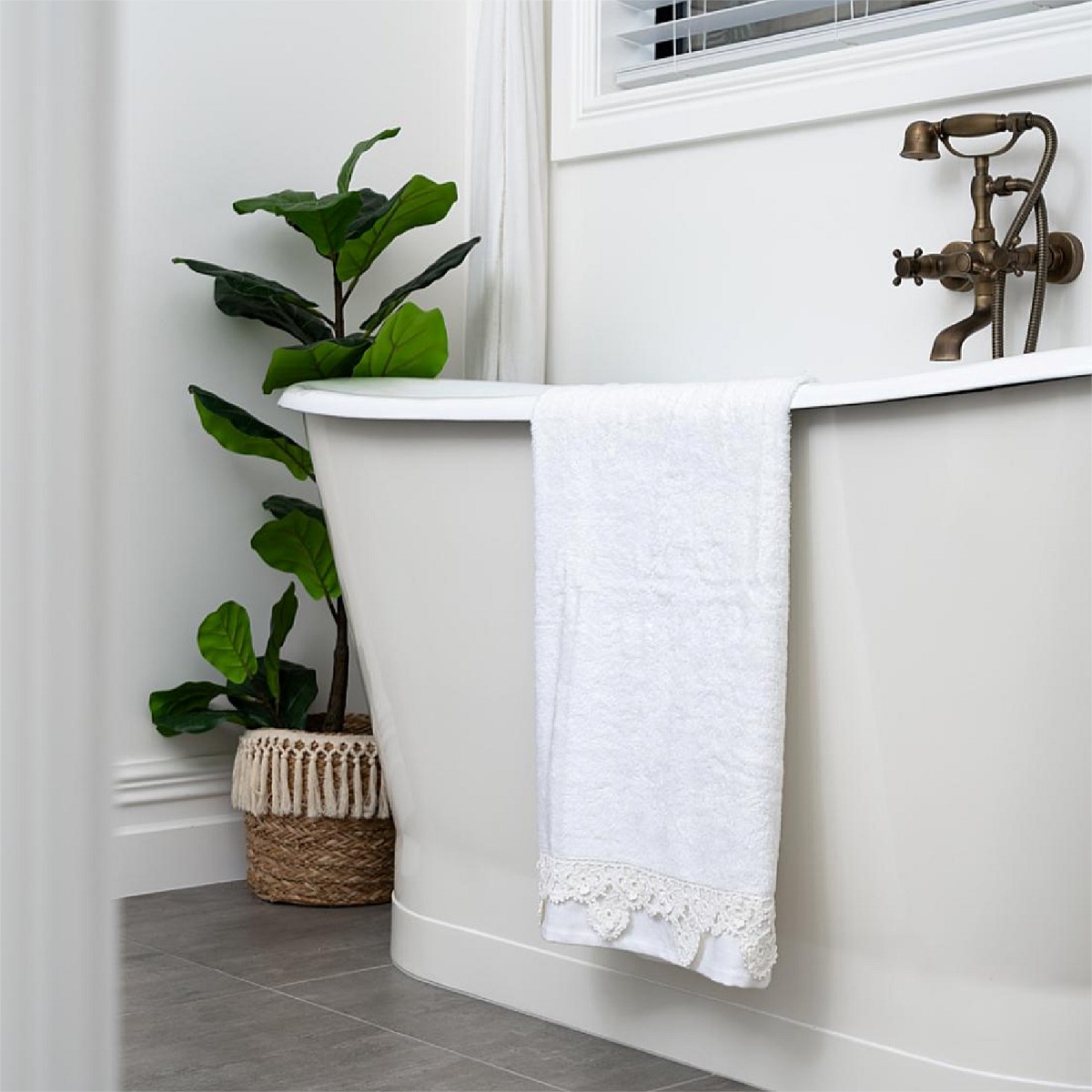 Elevate your bathroom with the Bamboo Towel with Lace Detail.