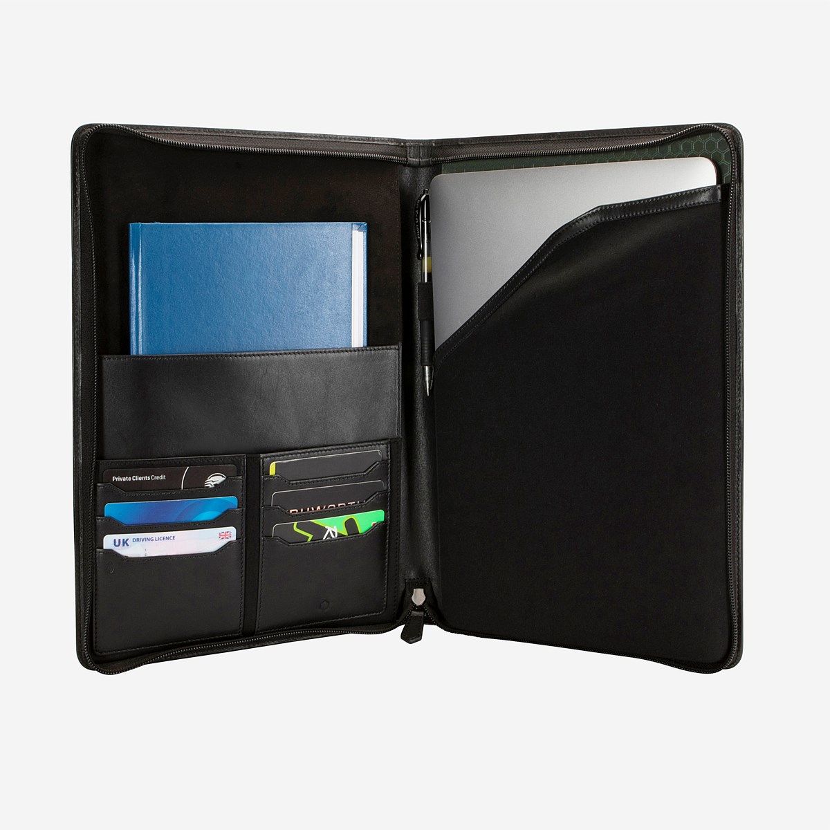 Take your office everywhere with this spacious leather A4 sleeve and folder, that carries a 13" laptop, cards, pens and documents. W 25cm x H 33cm x D 2cm