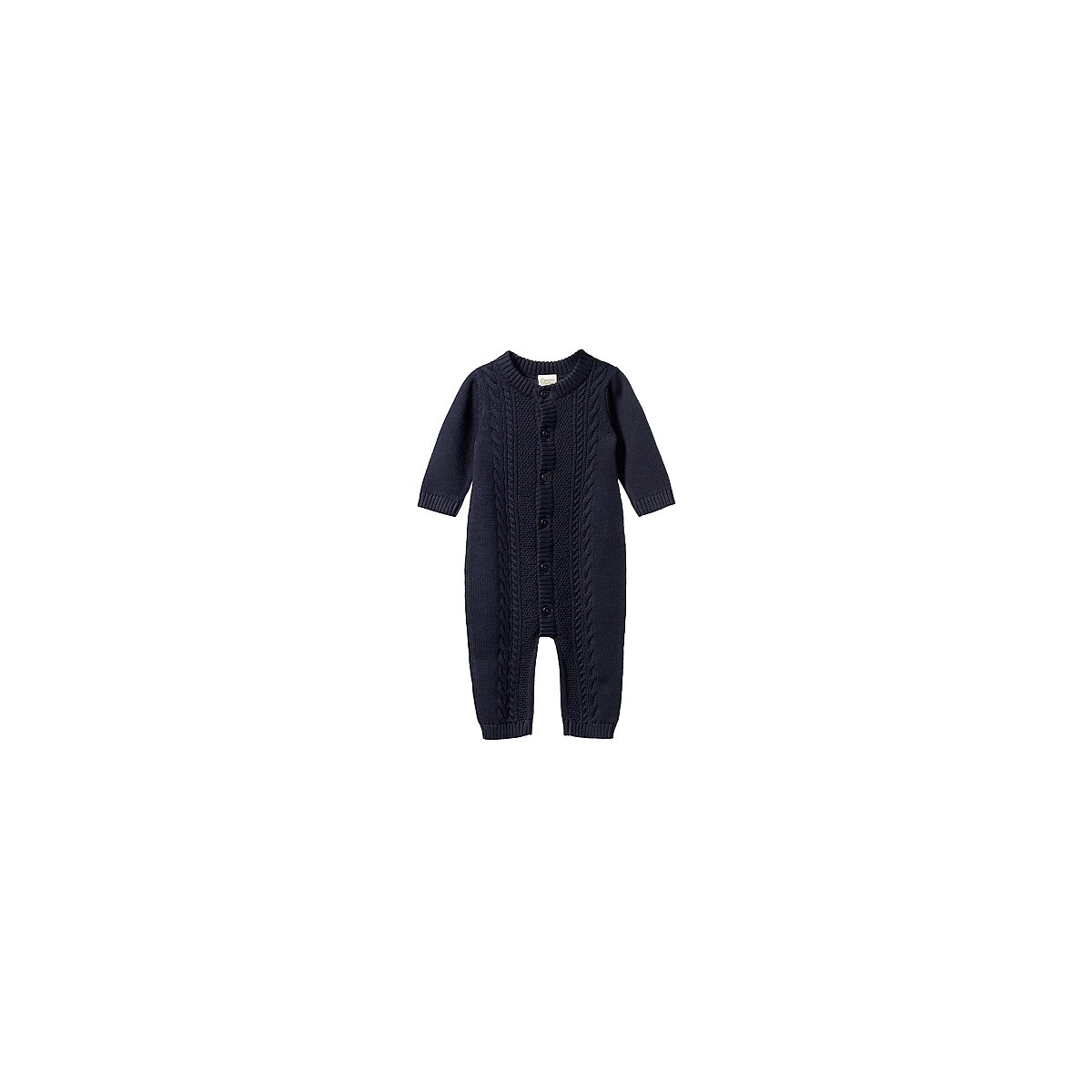 The snuggliest style, our Lou Suit is made from organic cotton, soft and gentle against baby?s skin while offering a layer of warmth. Knitted in stocking stitch with classic cable knit detailing on the front and finished with corozo nut buttons for easy dressing.