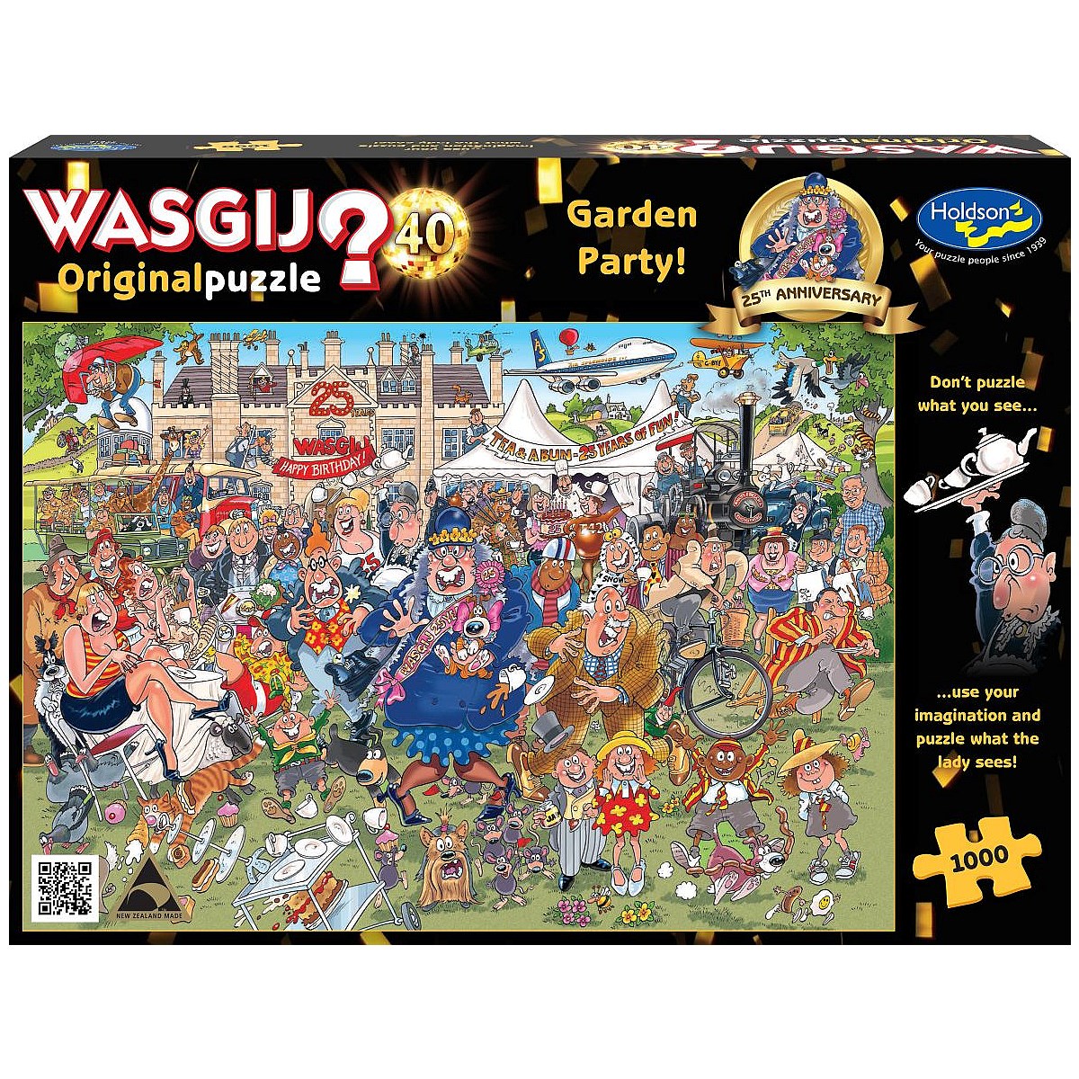 Join Granny Wasgij as she celebrates 25 glorious years with an extravagant garden party to remember. Everyone is having the time of their lives, but one latecomer’s arrival leaves the partygoers truly stunned. Who could it possibly be? Who is the special guest that has left the revellers lost for words? That is the image you need to puzzle. Wasgij Original is the what are they looking at? puzzle concept where you have to use your imagination and the clues provided to piece together what the characters in the image printed on the box are looking at. Approximate puzzle size 688x493mm. Manufactured in New Zealand by Holdson using vegetable based inks and recyclable materials. Suitable for ages 8+ years.