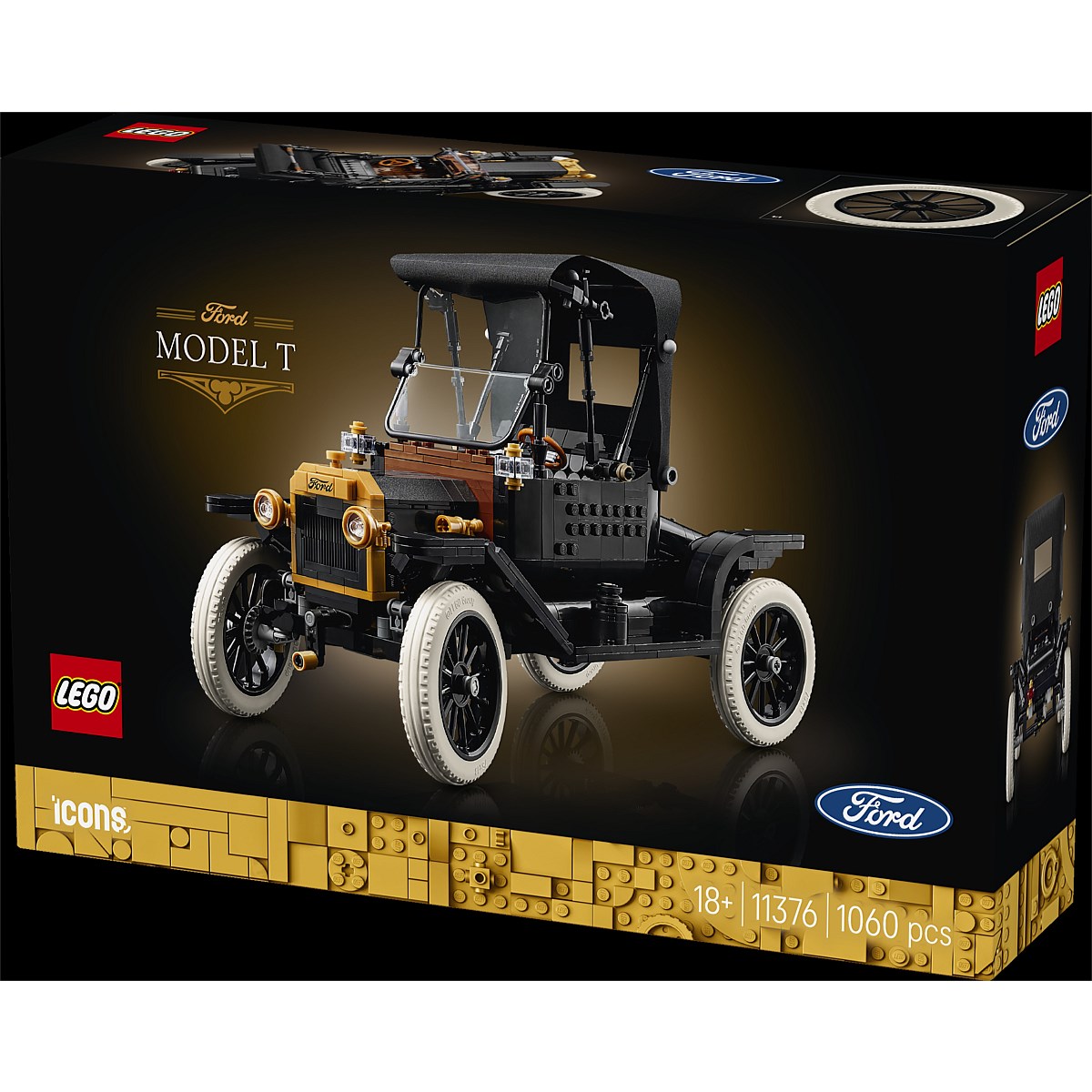 VINTAGE MODEL CAR KIT FOR AGES 18+ – Embark on a nostalgic journey with the LEGO® Icons Ford Model T (11376), a highly detailed model car kit for adults • VINTAGE CAR MODEL – Recreate the iconic 1910s automobile with gleaming black bodywork, golden accents, a foldback fabric roof and tall spoked alloy wheels with slim white rubber tyres • FORD MODEL T FUNCTIONS – Fold back the roof and fold down the split windscreen, lift the bonnet from both sides to see the engine, turn the crank to spin the fan and lift the seat to access the fuel tank • CLASSIC DISPLAY PIECE – This vintage car decor display model makes an elegant centrepiece for the home or office • GREAT GIFT FOR CAR LOVERS – Celebrate a birthday, Christmas or any other special occasion with this vintage car building set, a great gift for lovers of classic American cars • 3D BUILDING INSTRUCTIONS – Get the most out of this model car kit with the LEGO® Builder app, where you can view the model in 3D, track your progress and explore other building sets • CREATIVE PROJECTS FOR ADULTS – This LEGO® Icons Ford Model T building set is part of the inspiring range of creative LEGO projects (sold separately) designed specifically for adults