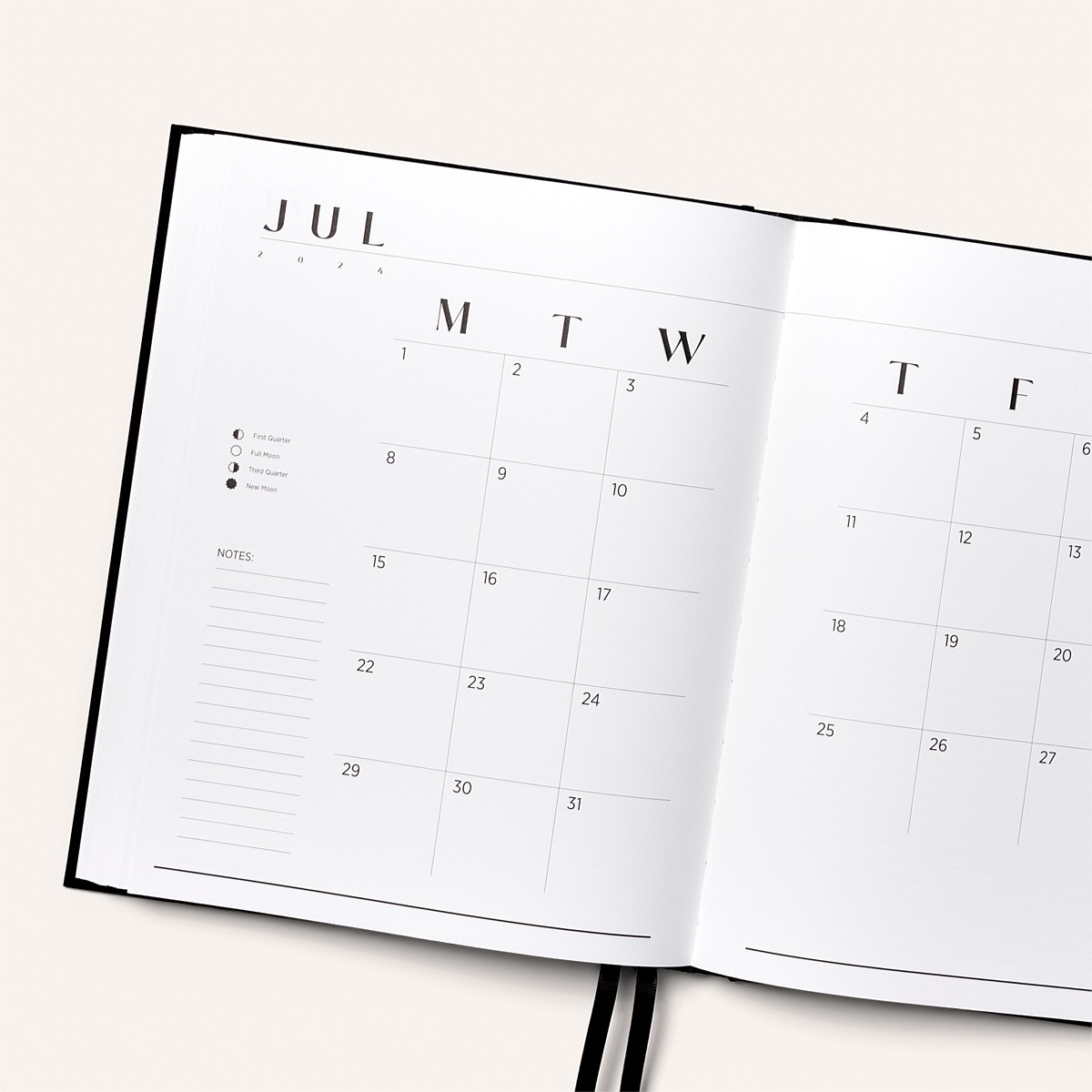 Enjoy new expanded pages with monthly and annual overviews, a Vision Board, Goal setting, Intentions, and Notes, along with the new Moon cycle displayed on the monthly overview.