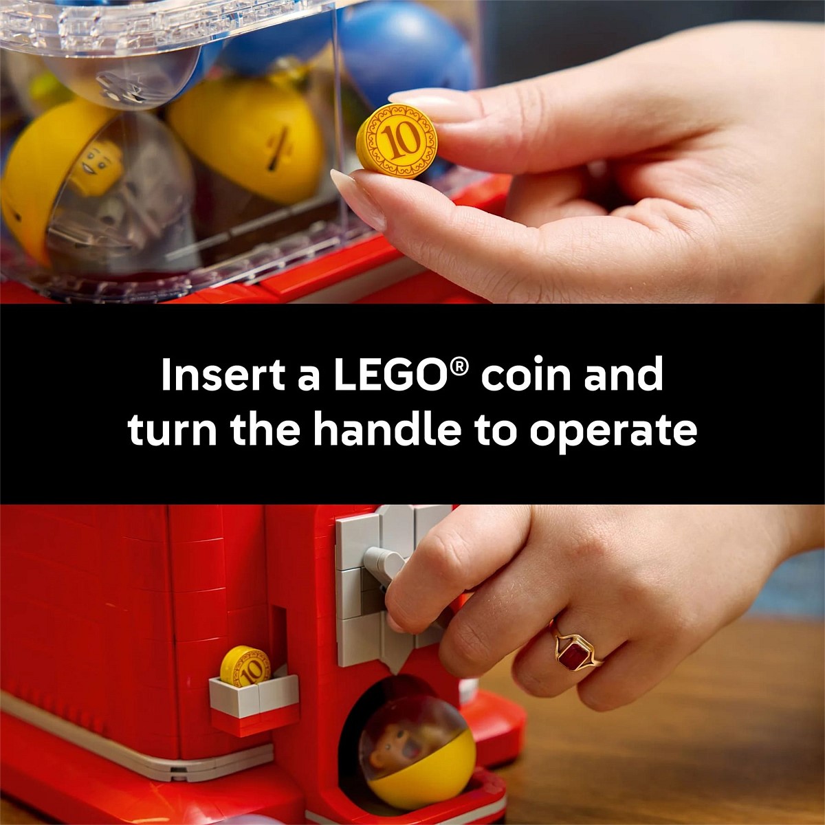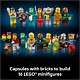 Authentic vending mechanism – Insert a LEGO® coin element in the slot, turn the handle to release a capsule and find the elements to build a LEGO minifigure in each capsule