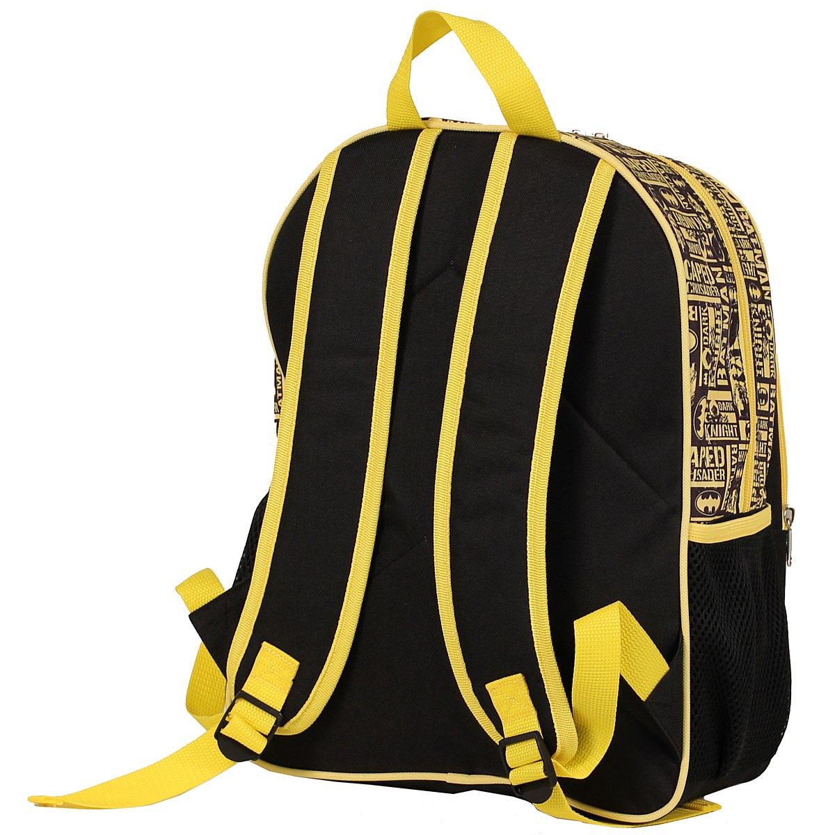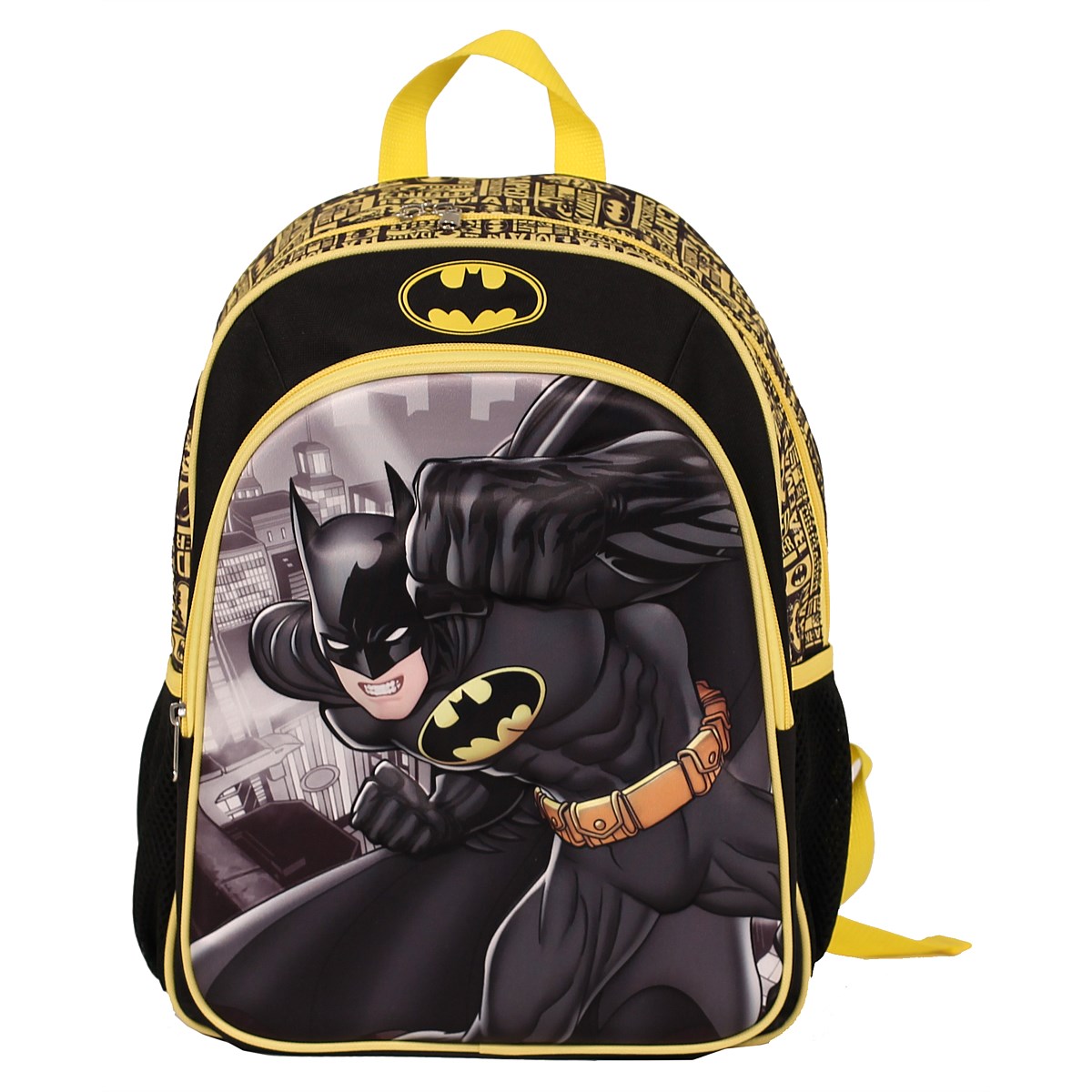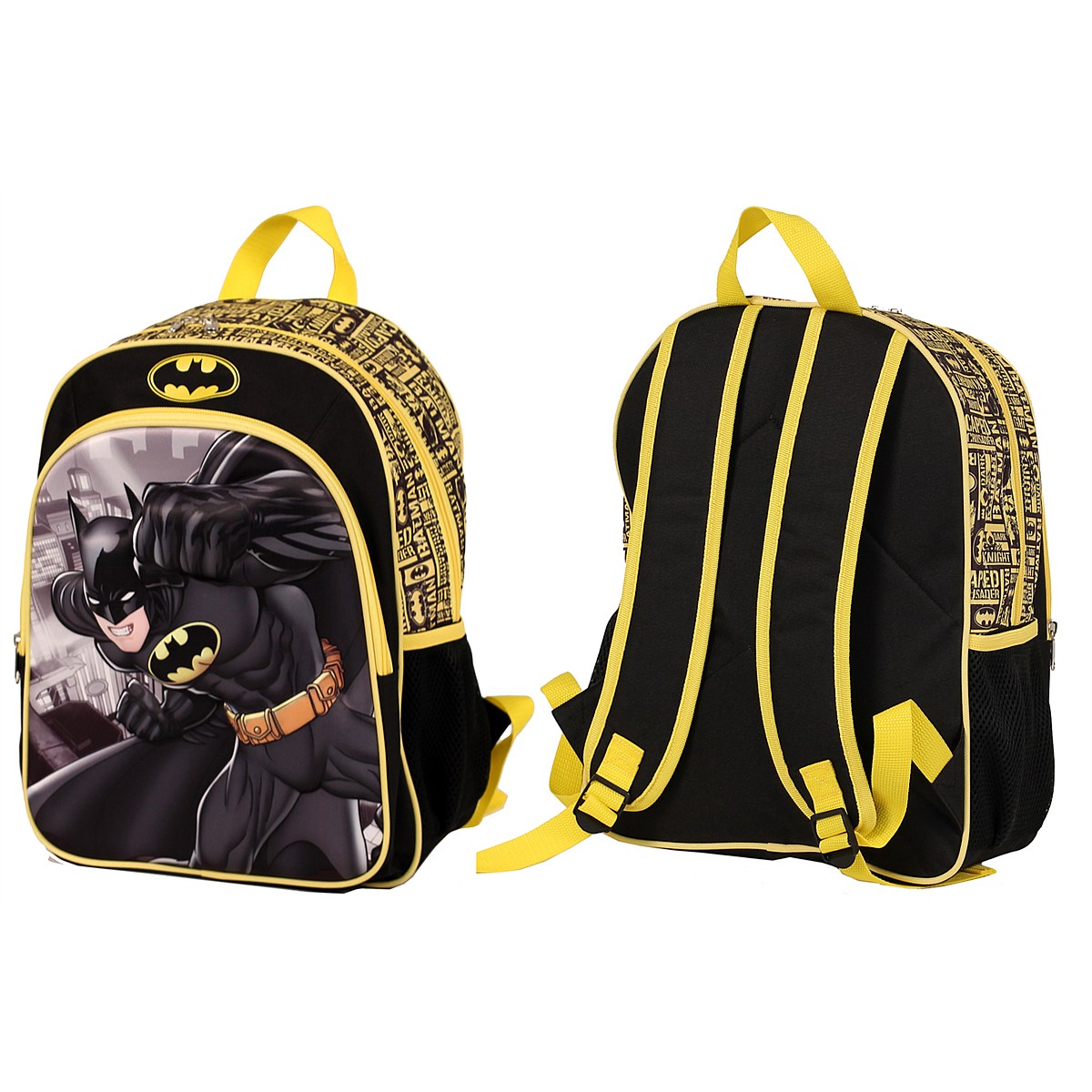 15 inch Batman Backpack . Features side pockets for drink bottle and front and main compartment providing plenty of room for school books, lunch boxes and your child?s favourite items. Adjustable shoulder straps, Zipped front pocket, Large main compartment, Nest side pockets for water bottle, Smart sleeve, Officially licensed H38*W27*D12 CM