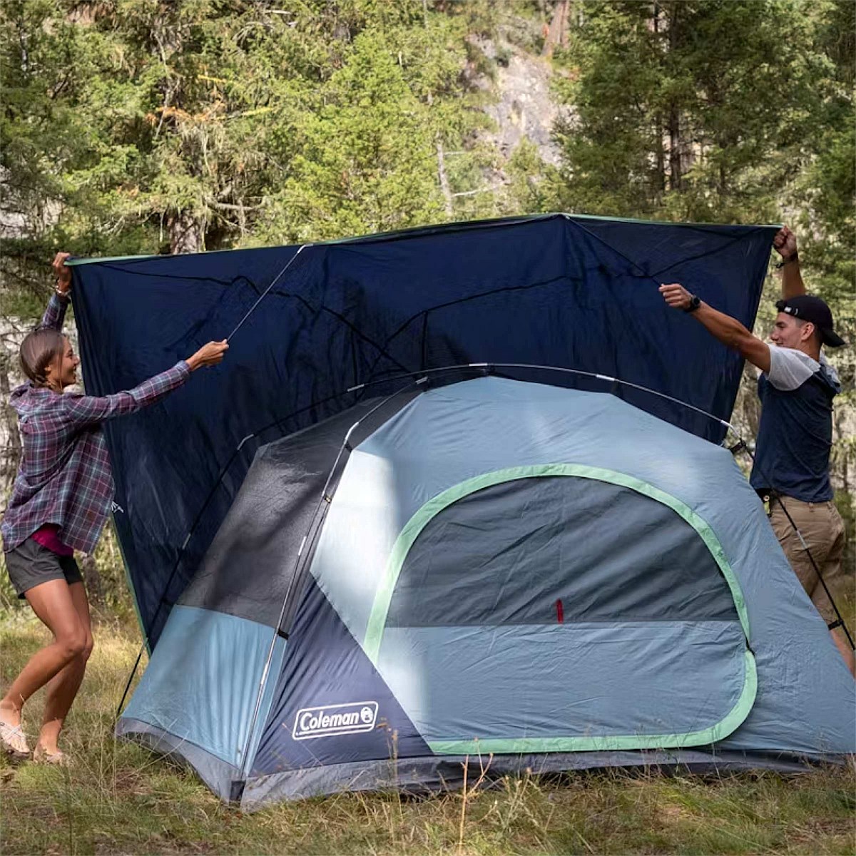 Sets up in under 5 minutes so you spend less time pitching the tent and more time relaxing at the campsite. The Coleman Skydome Camping Tent with Full-Fly Vestibule offers extra weather protection and more storage space with the full-fly vestibule area. Go ahead and stretch out inside. The nearly vertical walls offer 20% more headroom than a traditional Coleman dome tent. Plus, a wide door design means you can move airbeds, sleeping bags, and other gear in and out with ease. Downpour in the forecast? This tent features the WeatherTec system, with welded corners and inverted seams that help keep you and your gear dry. Plus, the strong frame has been tested to withstand up to 35 mph winds. Roof vents and mesh back wall help with ventilation and airflow inside the tent for ultimate comfort. An E-port makes it easy to access an extension cord so you can bring electrical power inside your tent.