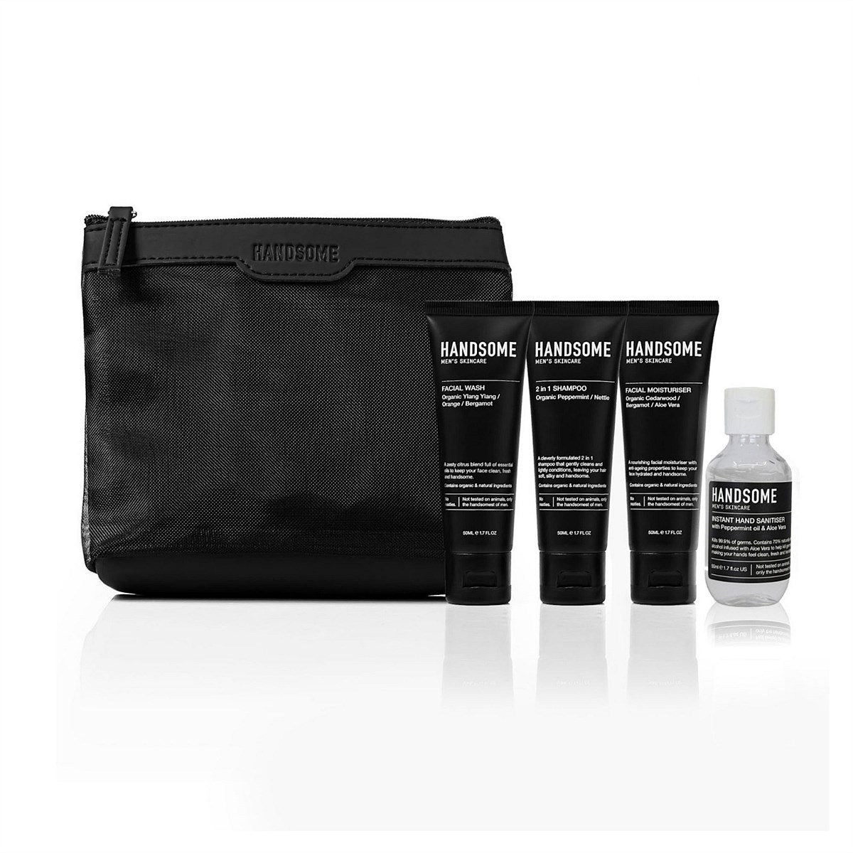 Handsome Voyager set contains 4 x 50ml Travel Size Essentials: Handsome Facial Wash, Facial Moisturiser, 2in1 Shampoo, and Peppermint Hand Sanitiser, in a mini black bag.