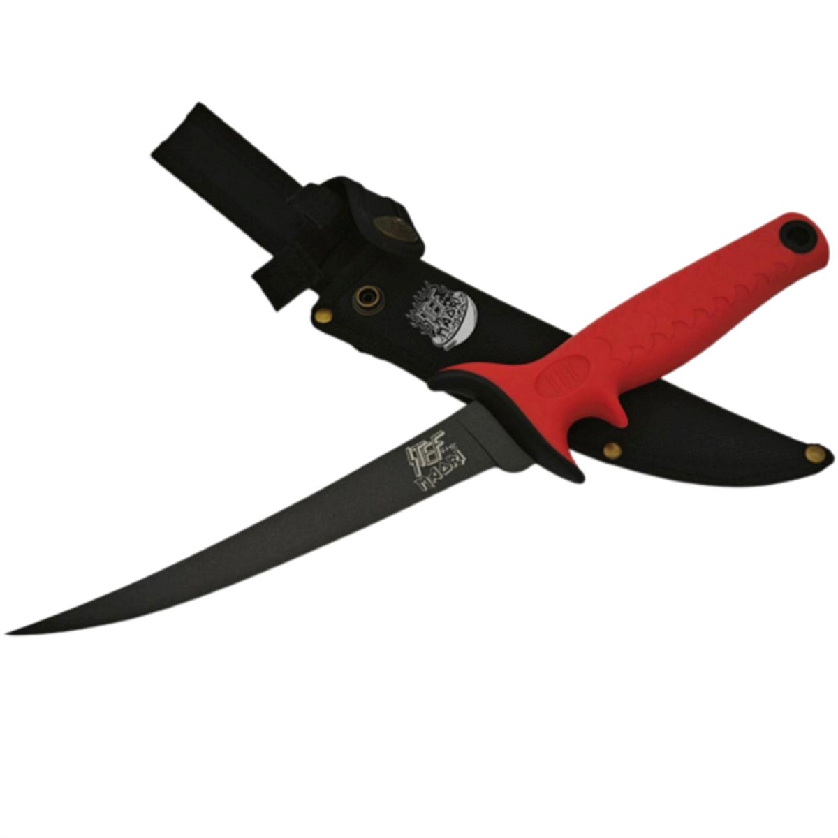 5CR15 stainless steel with a black non stick coating. Rubber & plastic handle with a printed nylon sheath.