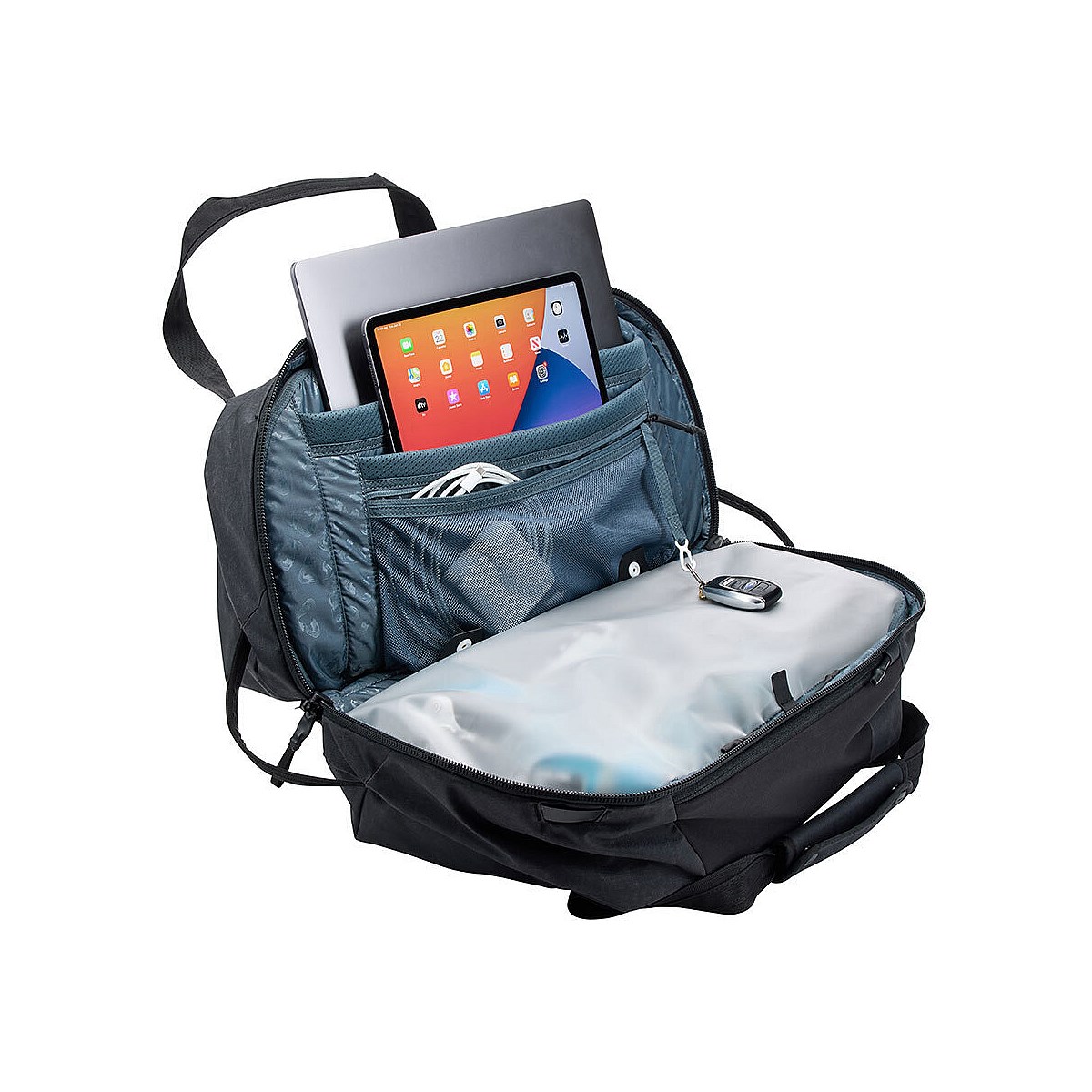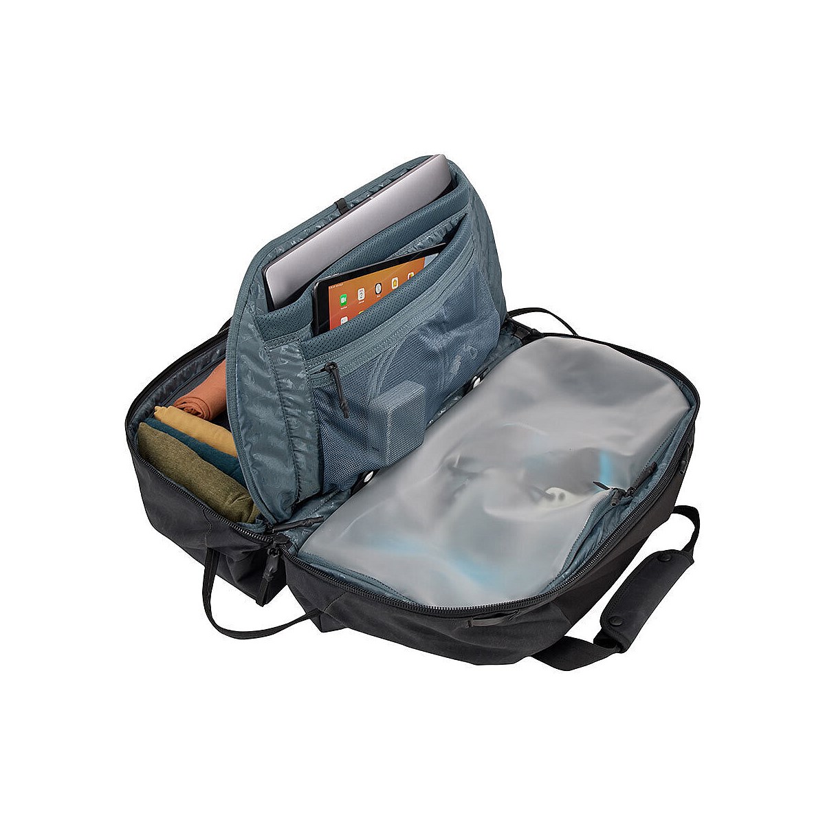 Thule Aion 35L duffel bag has an internal divider that separates the duffel into two compartments, making it easy to keep everyday items separate from outdoor gear. The TPU-lined compartment locks in all odor, dirt, and moisture - perfect for storing dirty clothes or damp sportswear. The duffel also has storage space for a 15.6" PC/16" MacBook and 12.9" tablet and attaches to rolling luggage thanks to the pass-through panel.