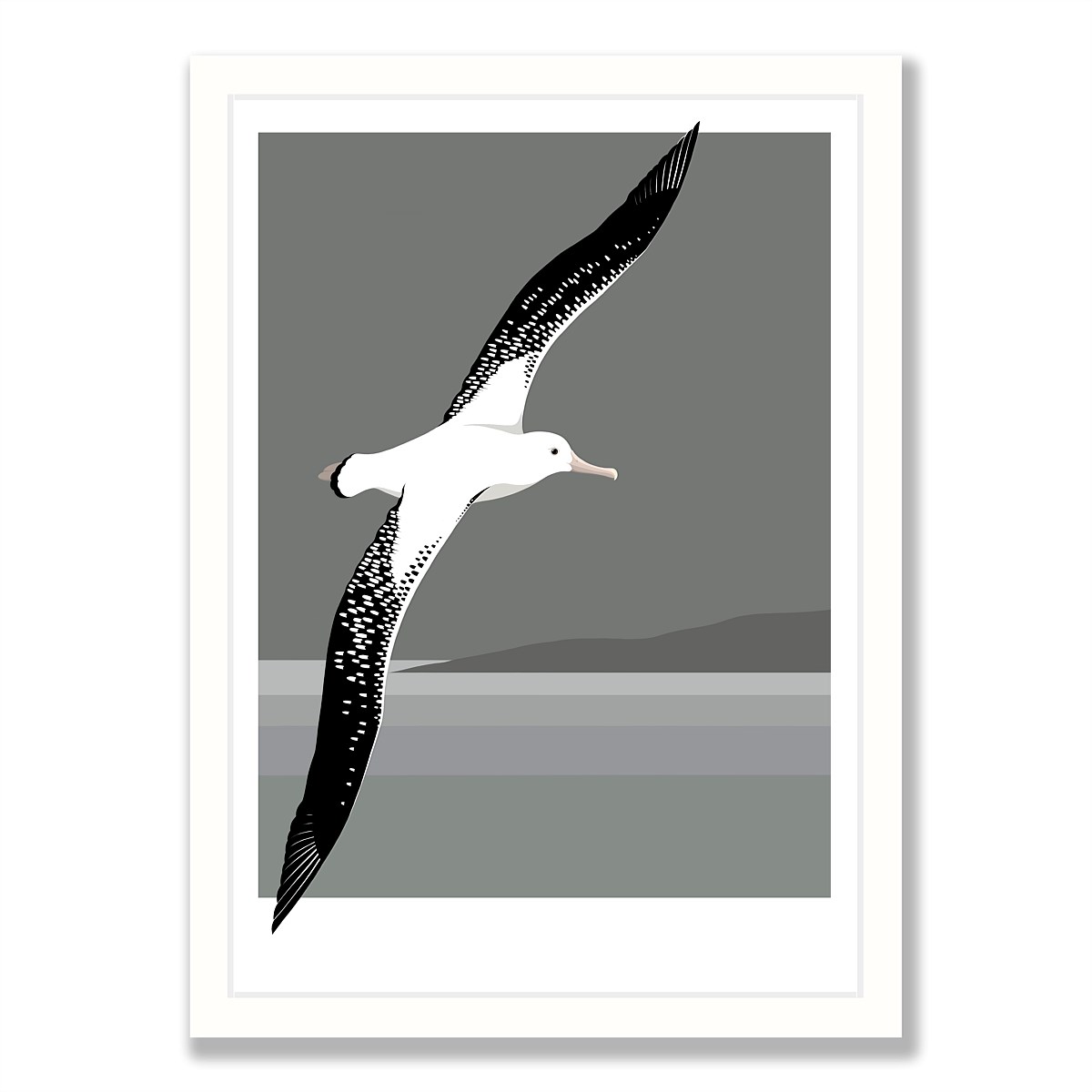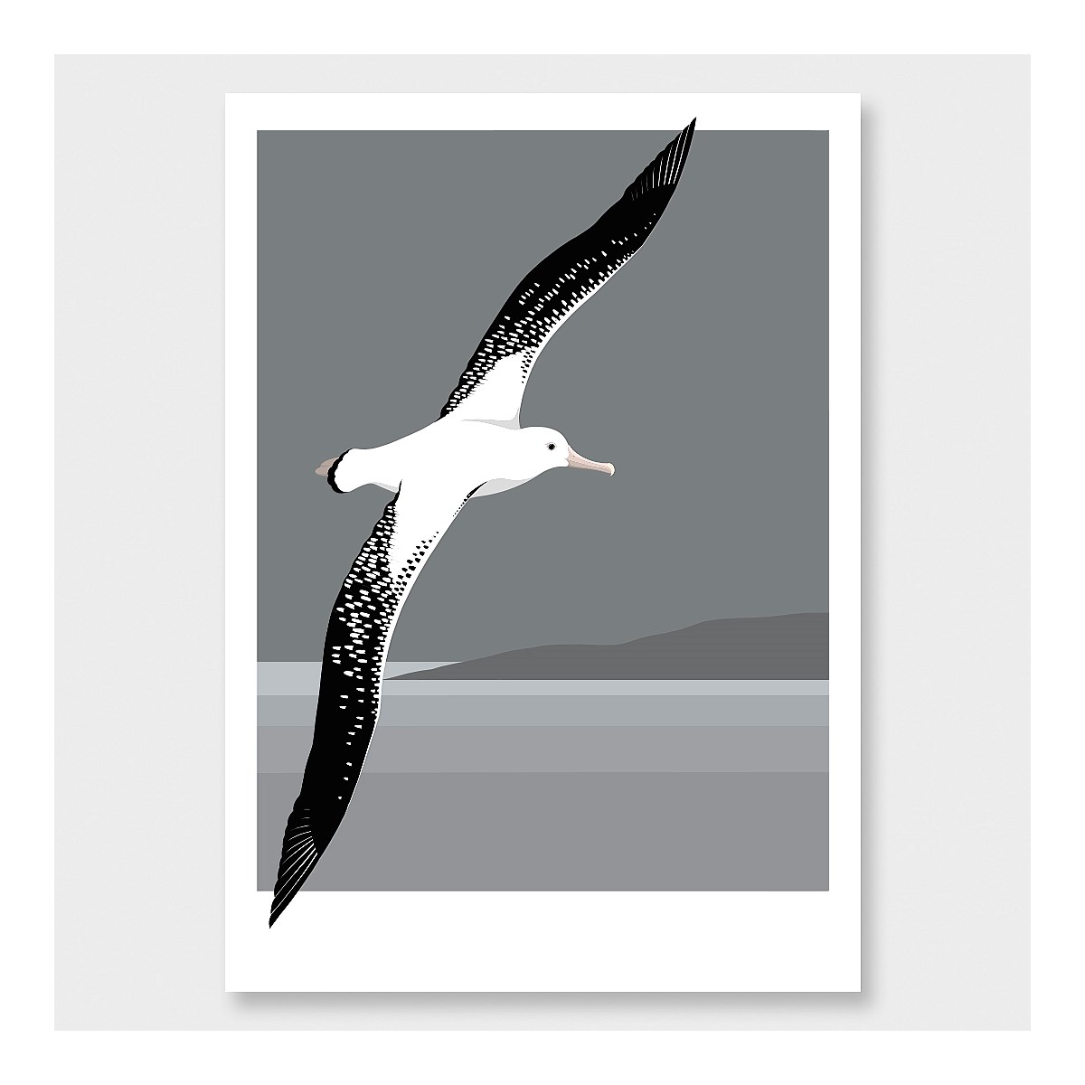 Created by local artist Cathy Hansby, drawn freehand using a digital tablet and desktop. Her modern style captures the personality of our unique wildlife, with bold colour and subtle detail. Cathy's art supports NZ Forest & Bird with their conservation work. The Albatross image features bold black and white against a moody grey background. Each art print is printed to order, producing a high quality Giclee fine art print on smooth archival art paper. Giclee is one of the best reproduction methods available, using acid free paper and the latest archival inks. Prints have a lifespan over 100 years.