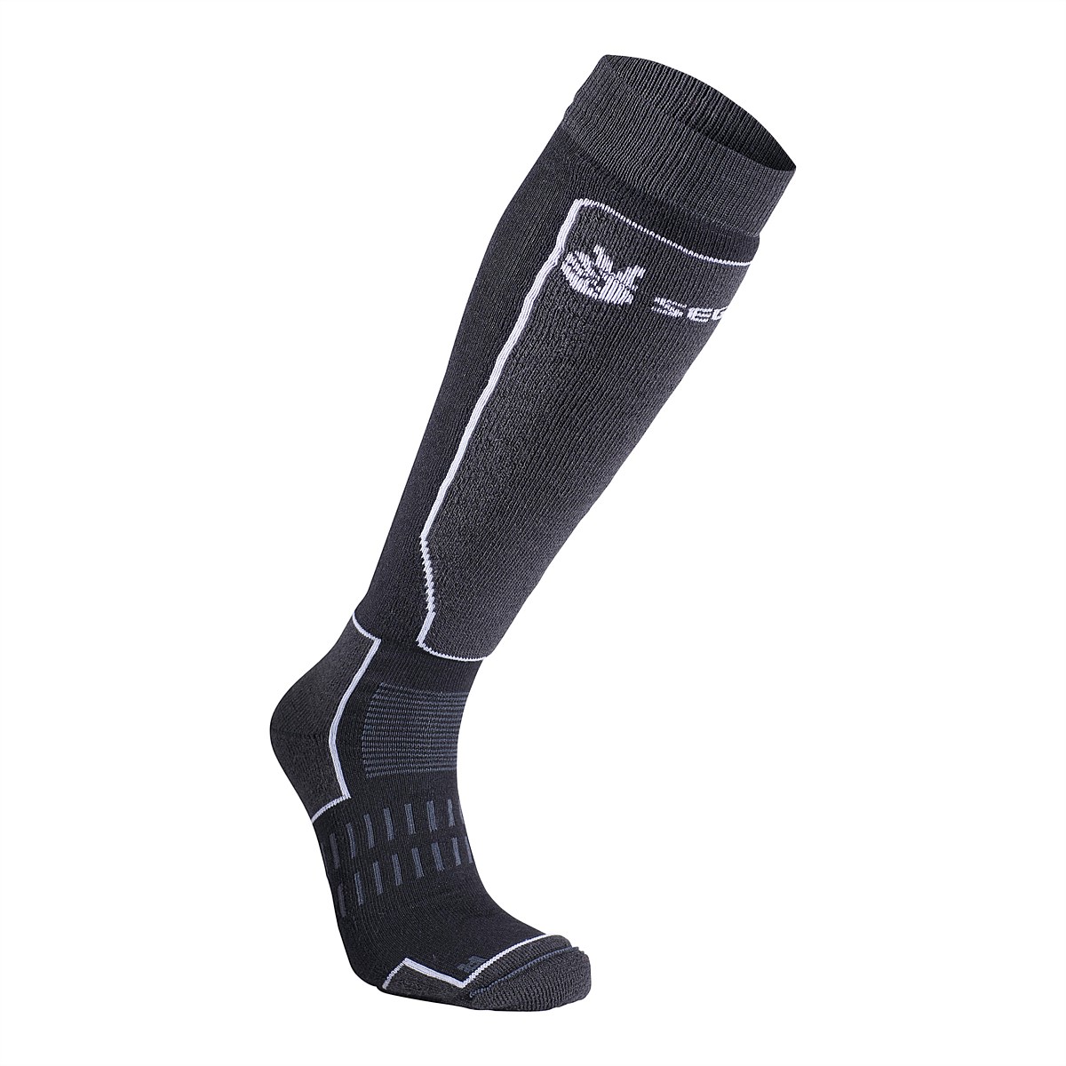 Our most popular alpine sock in EXP Merino wool. Elastic around the arch and ankle to keep it in place, terry under the foot and on the shin for comfort and pressure relief from the plow, the terry also goes high up around the heel to reinforce the heel grip in the boot, Thin top to fit in the boot without pressure, Seamless construction. Covers most people's need for a good alpine sock.