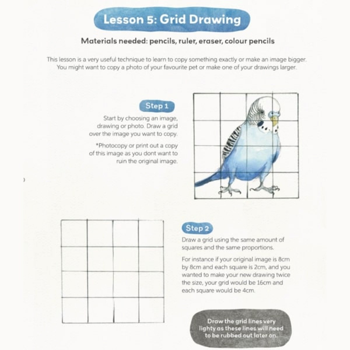 – 2H/HB/2B/4B/6B graphite pencils, 8 double-sided colour pencils (16 colours), 8 soft pastels, fineliner, blending stump, charcoal, pencil sharpener, kneader eraser, eraser and ruler