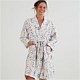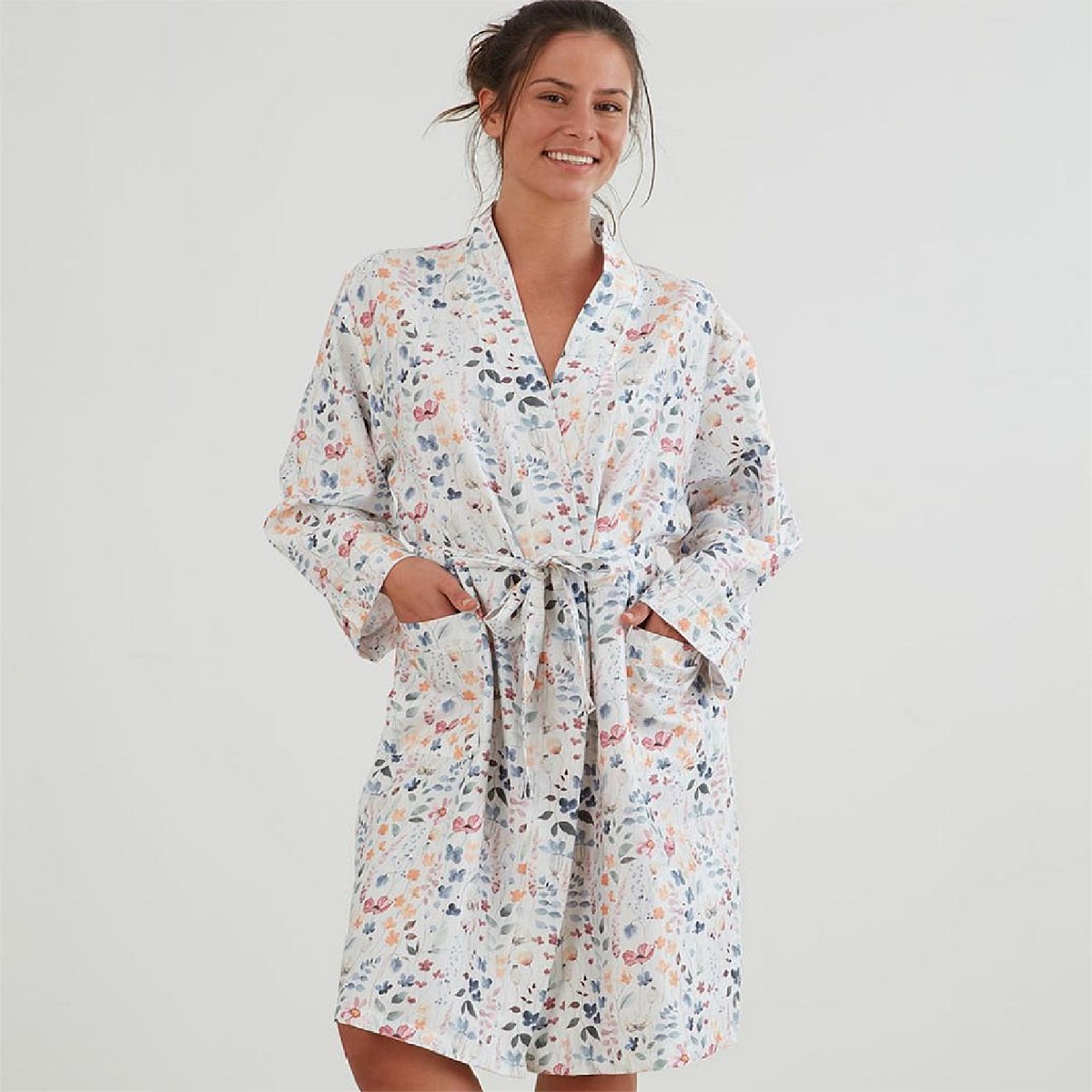 100% Cotton Sateen. Soft botanical digital print. Knee-length Kimono style robe with pockets and tie waist.
