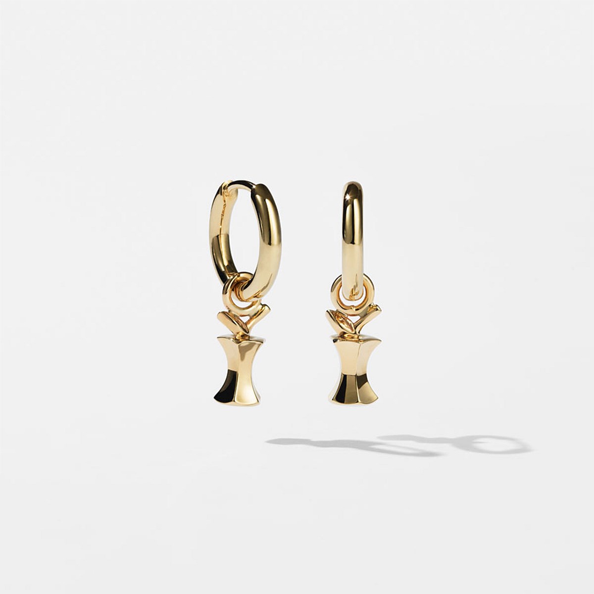 - Suspended on bold hoop earrings with hinge and clicker closure