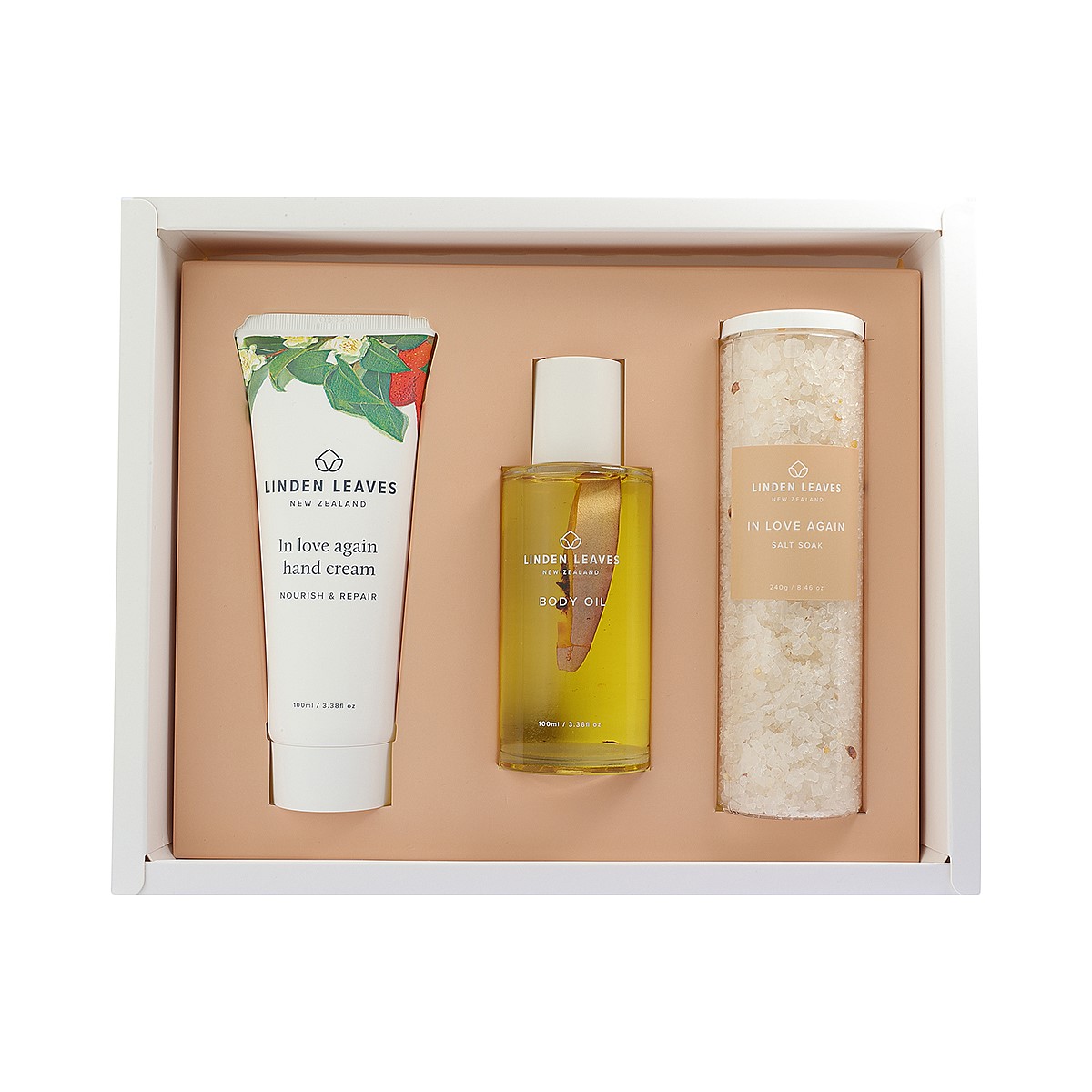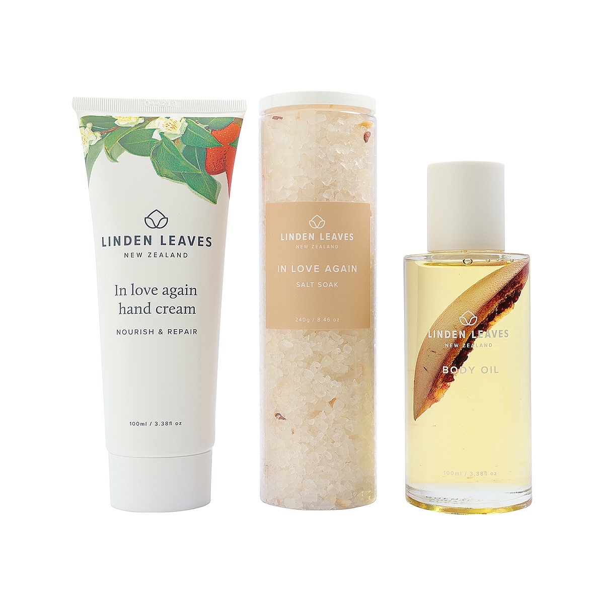 Indulge in a luxurious self-care ritual with this elegant trio, infused with our signature In Love Again fragrance – a romantic blend of sandalwood, neroli, and vanilla.
