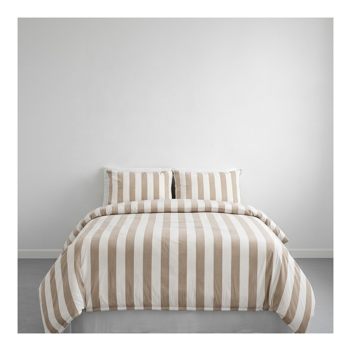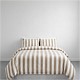 The Bari Stripe Taupe quilt features a bold yet timeless design defined by wide vertical stripes in warm taupe and crisp white. The evenly spaced stripes run the full length of the quilt, creating a clean and structured pattern that adds visual interest while maintaining a balanced, minimalist look. The soft taupe tone brings warmth and depth to the quilt, while the white stripes keep the design feeling fresh and bright. 100% Cotton, Available in quilts and duvet sets, in Taupe and Stone Green.