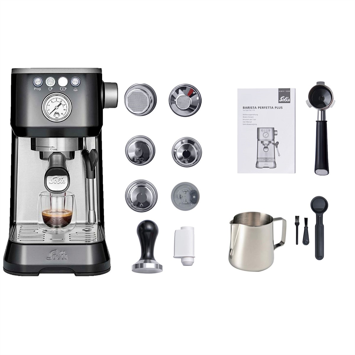 In addition to espresso, the Solis Barista Perfetta Plus can also serve hot water and is equipped with a professional 360-degree rotatable steam wand to serve a perfect cappuccino or latte macchiato. A stainless-steel milk jug accompanies the machine in the box, so that you can get started right away. The Solis Barista Perfetta Plus comes with both, single-wall and double-wall filter inserts of 54 mm, allowing you to prepare one or two cups and use freshly ground as well as pre-ground coffee. Don't worry about the dose amount of ground coffee in the filter: a measuring spoon and a tamper are included. Do you prefer to use pads? A filter for E.S.E. pads is included in this appliance's accessories.