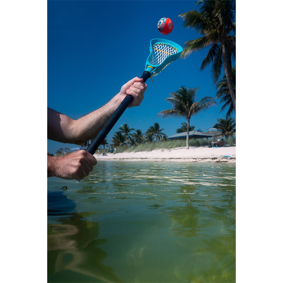 Game changer! Play lacrosse in the water with a water bouncing Waboba ball instead of a regular ball. This Water Lacrosse set comes with 2 lacrosse sticks and 1 Waboba Original ball, which bounces on water. Spread out and play. The sticks feature a water-resistant neoprene sleeve to give players a better grip when throwing and catching. Game on!