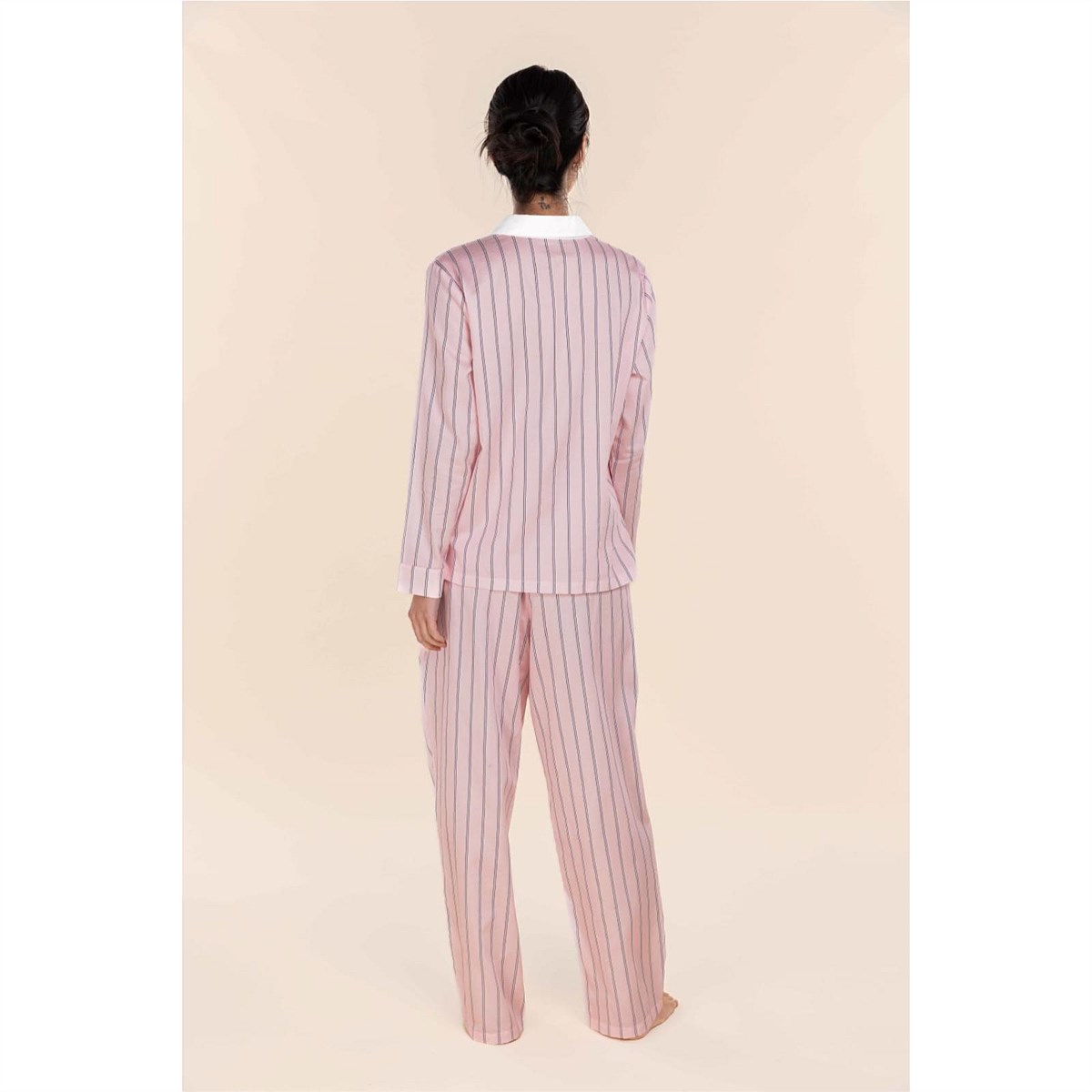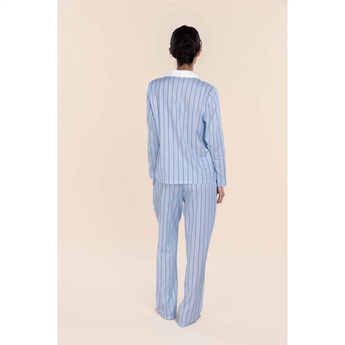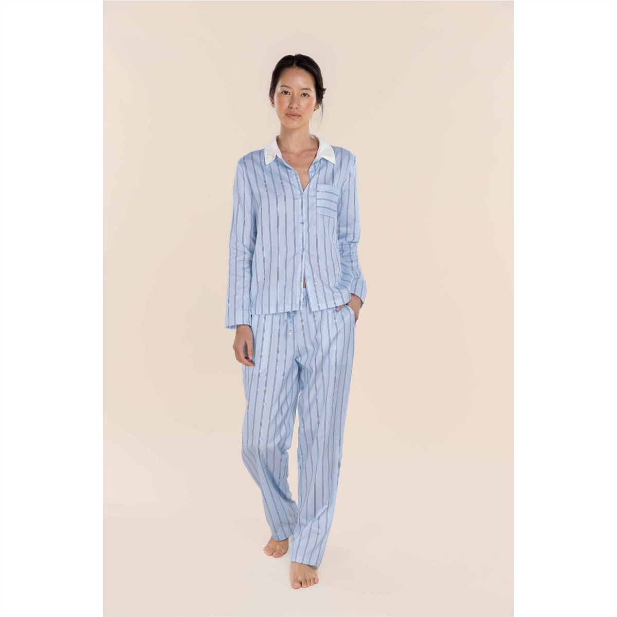 Find comfort in the classics with the Belinda Pyjama Set. Crafted from breathable cotton sateen, this women’s long sleeve pyjama set keeps you cool at night while feeling soft against the skin. The crisp striped shirt with a fresh white collar gives a tailored touch, while the full-length pants are designed for ease, making this set as practical for slow mornings as it is for restful nights.
