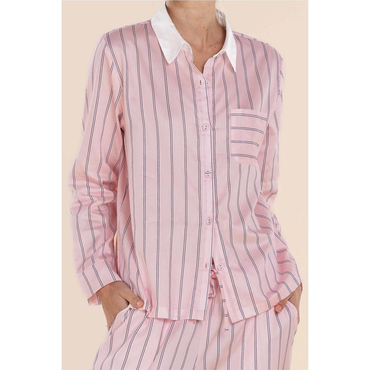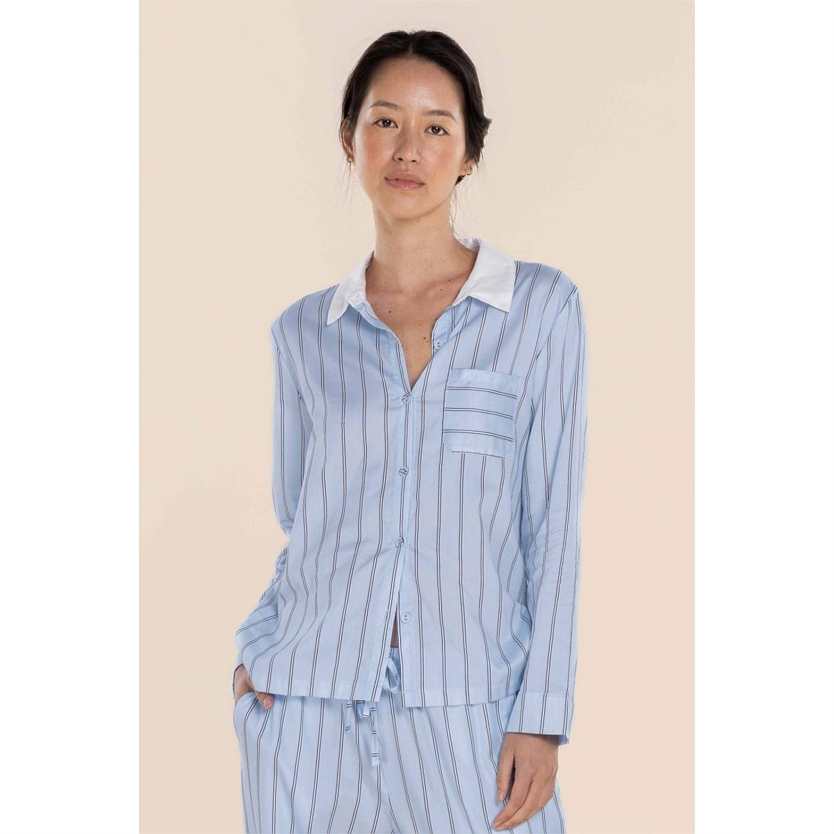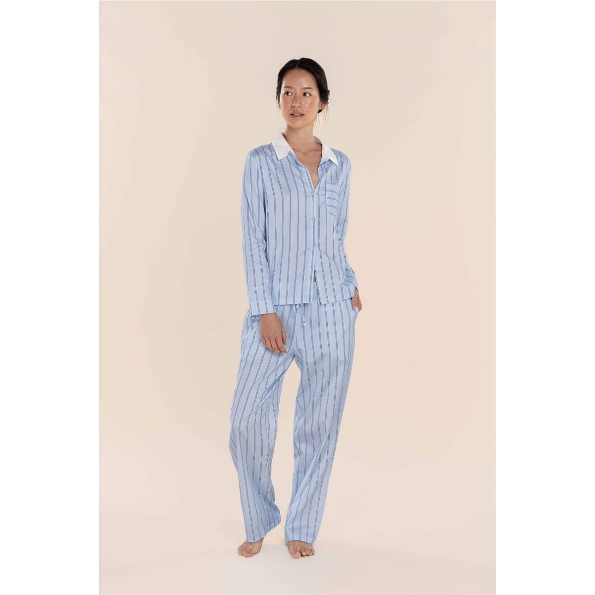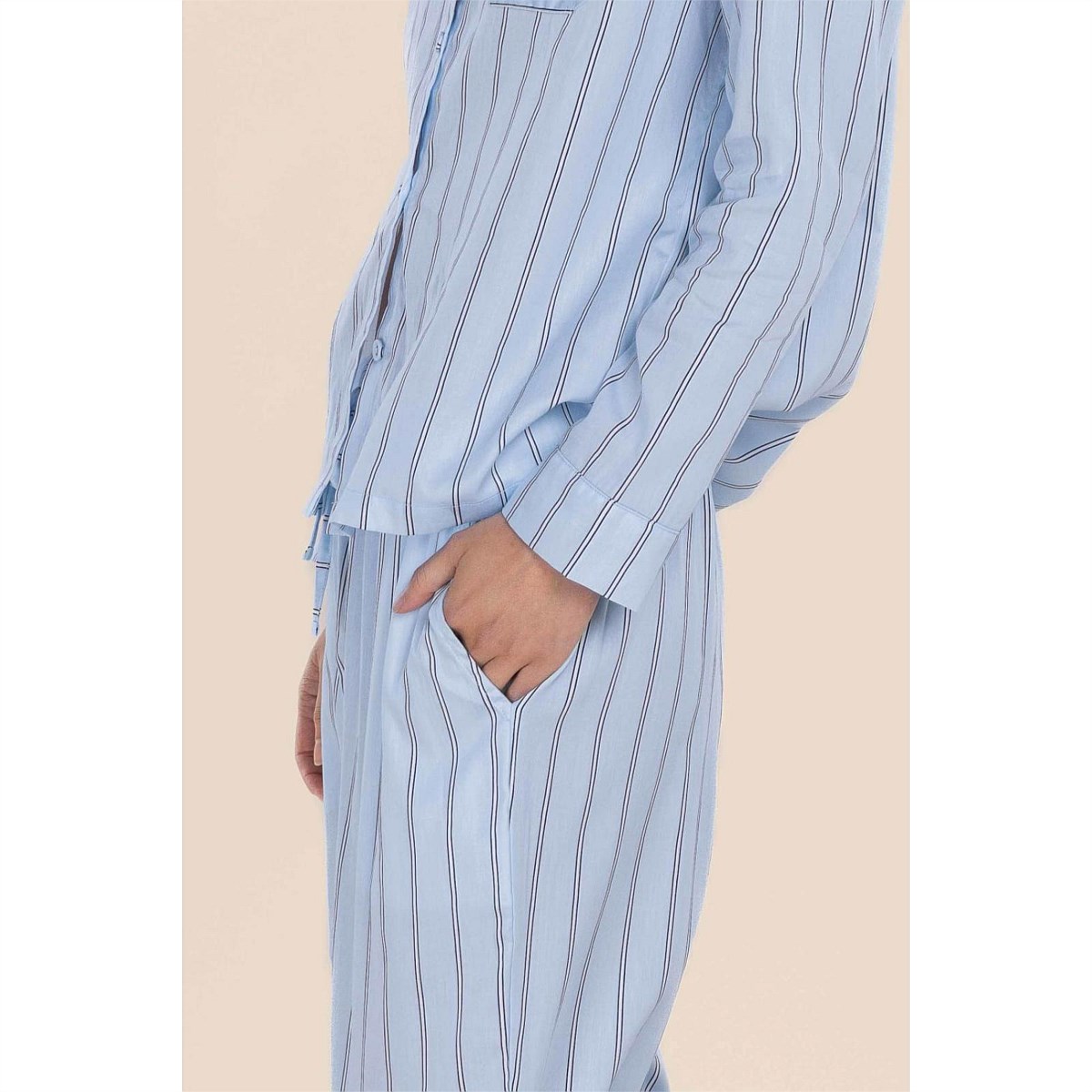 Find comfort in the classics with the Belinda Pyjama Set. Crafted from breathable cotton sateen, this women’s long sleeve pyjama set keeps you cool at night while feeling soft against the skin. The crisp striped shirt with a fresh white collar gives a tailored touch, while the full-length pants are designed for ease, making this set as practical for slow mornings as it is for restful nights.