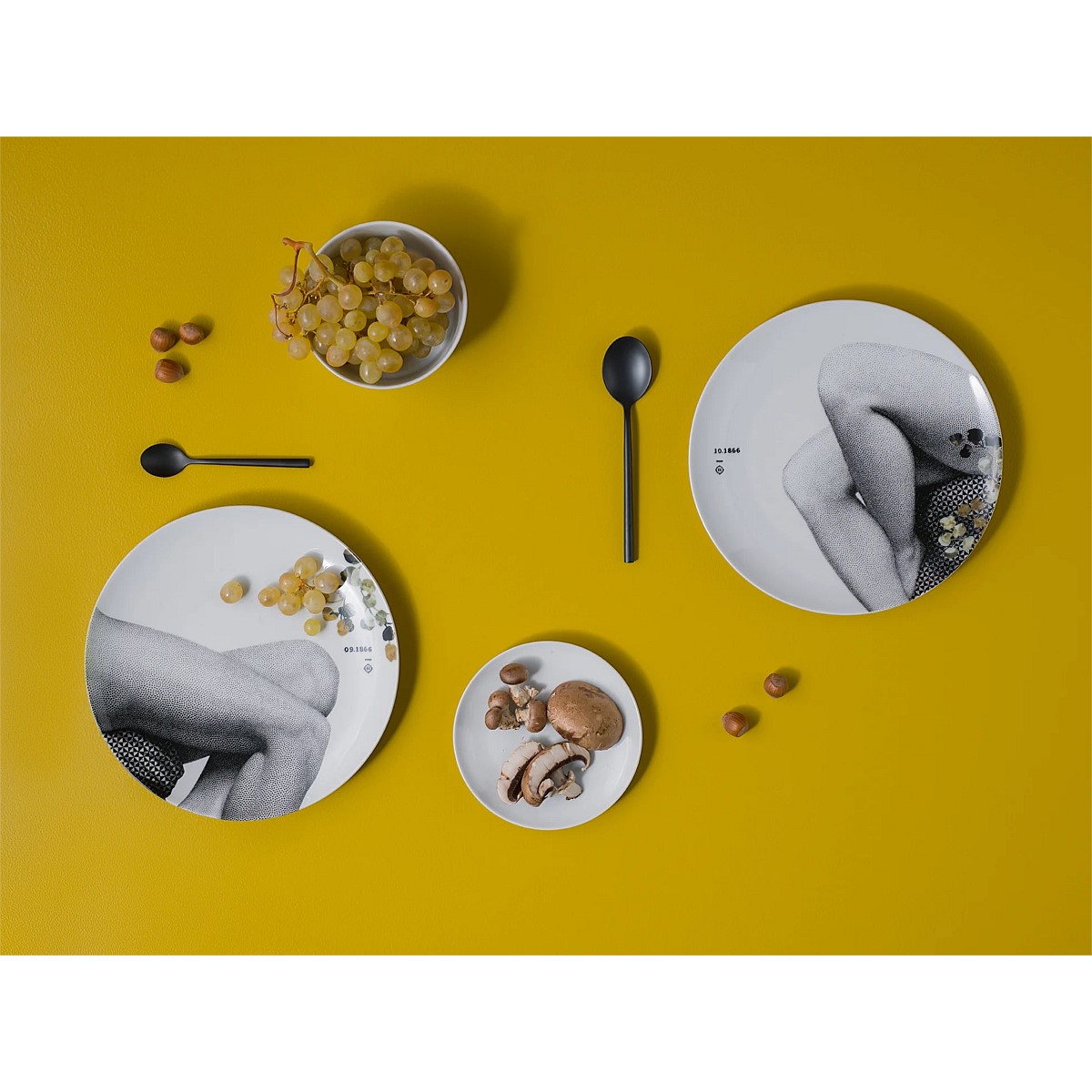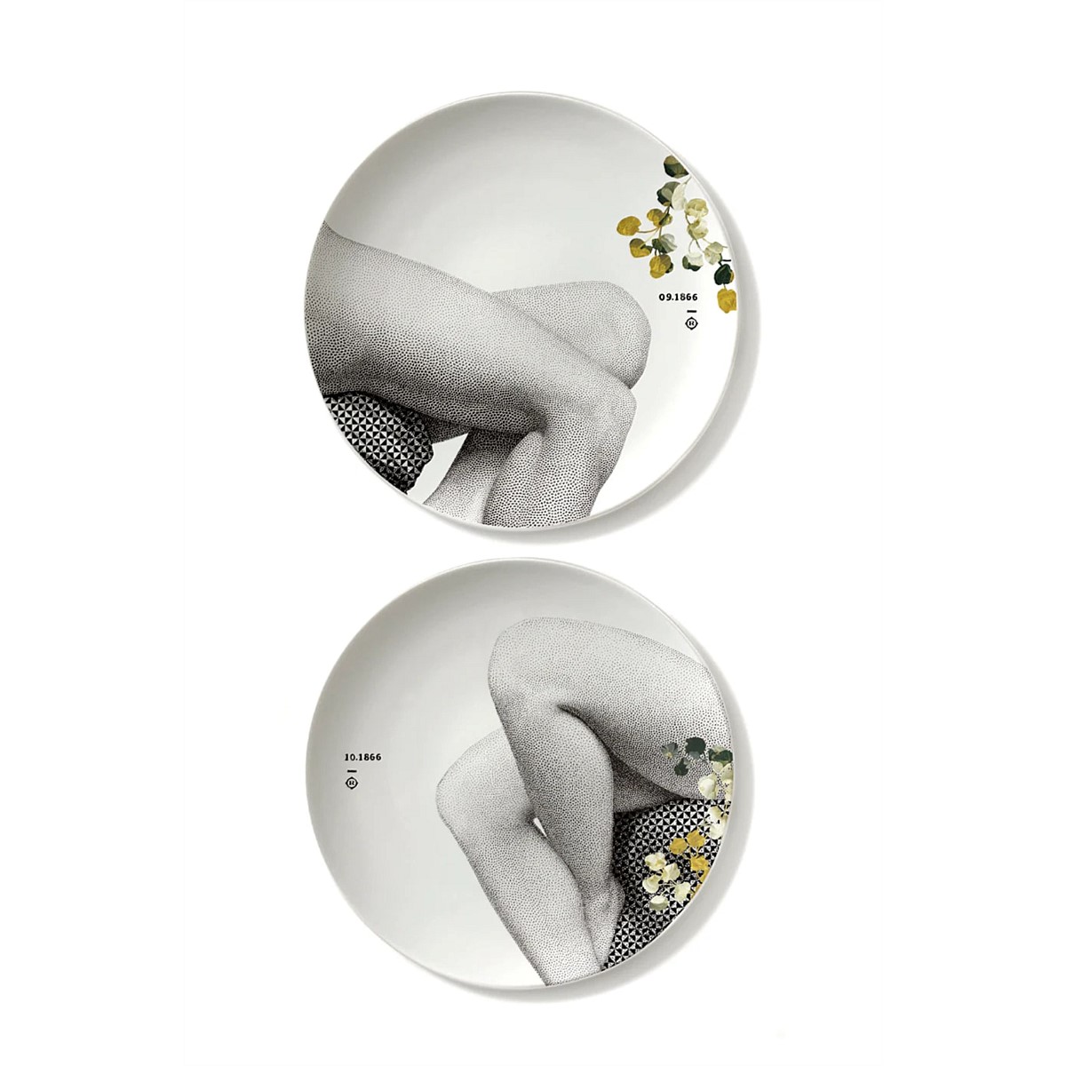The new Parnasse collection in porcelain duos is an ode to the nobility of worked stone. Rachel Convers invites us on a bucolic stroll where the statues of the park, immortal presences of outdated beauty, are slowly colonised by the vegetation. In each pair of plates, the beautiful courtesans with their stone bodies dialogue delicately with the refinement of the porcelain.