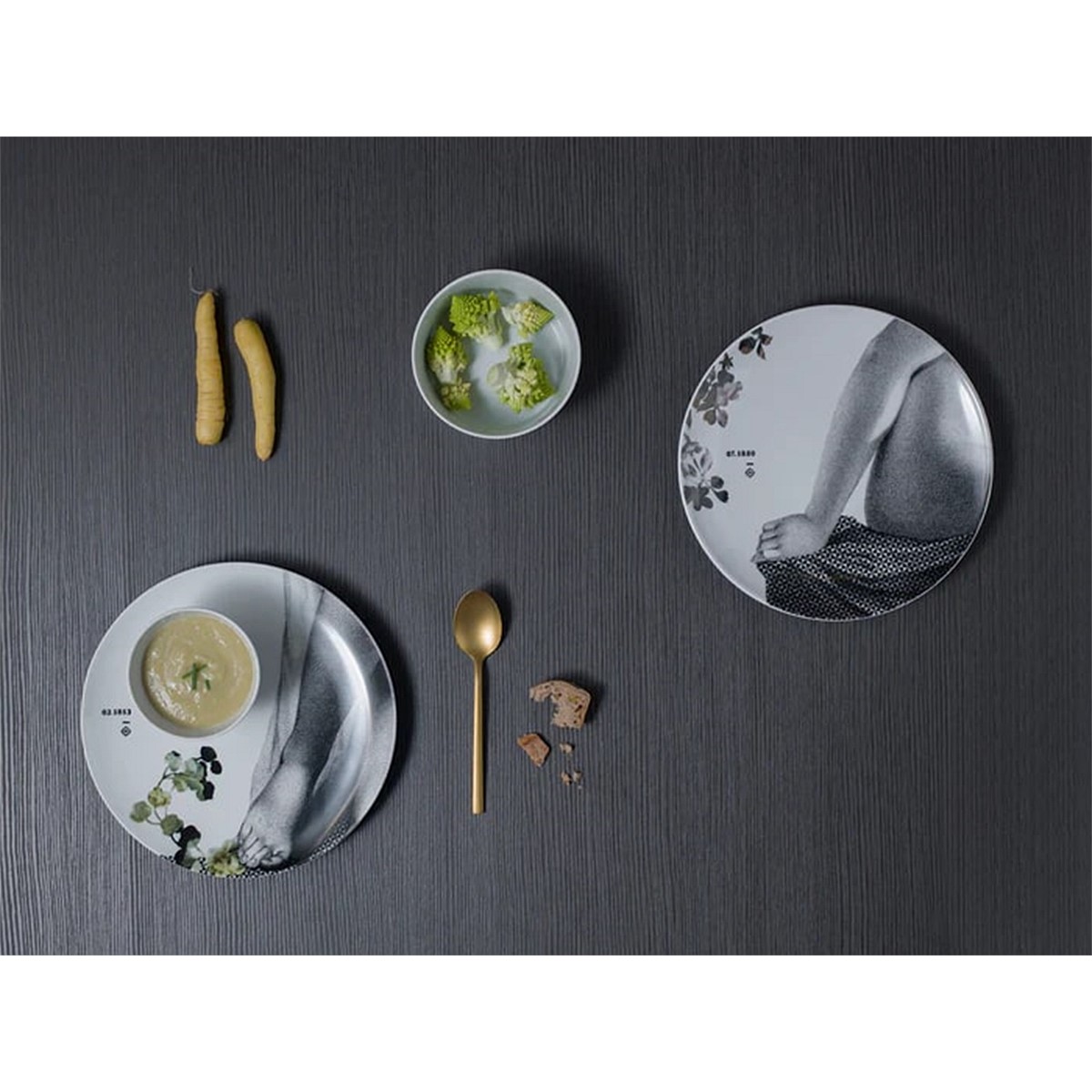 The new Parnasse collection in porcelain duos is an ode to the nobility of worked stone. Rachel Convers invites us on a bucolic stroll where the statues of the park, immortal presences of outdated beauty, are slowly colonised by the vegetation. In each pair of plates, the beautiful courtesans with their stone bodies dialogue delicately with the refinement of the porcelain.