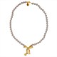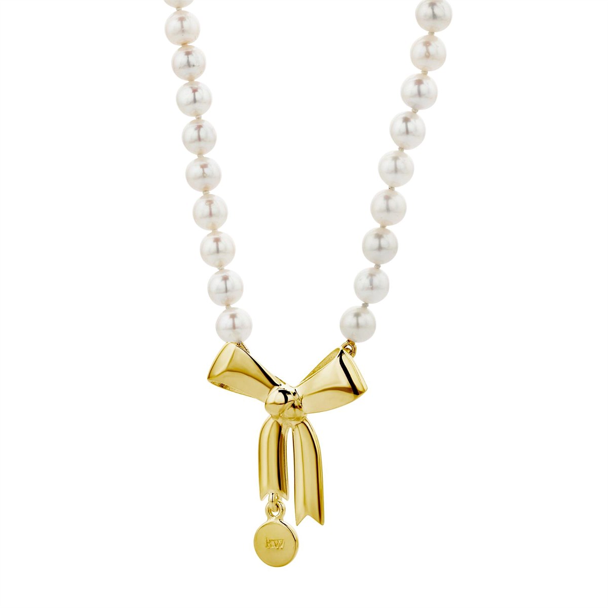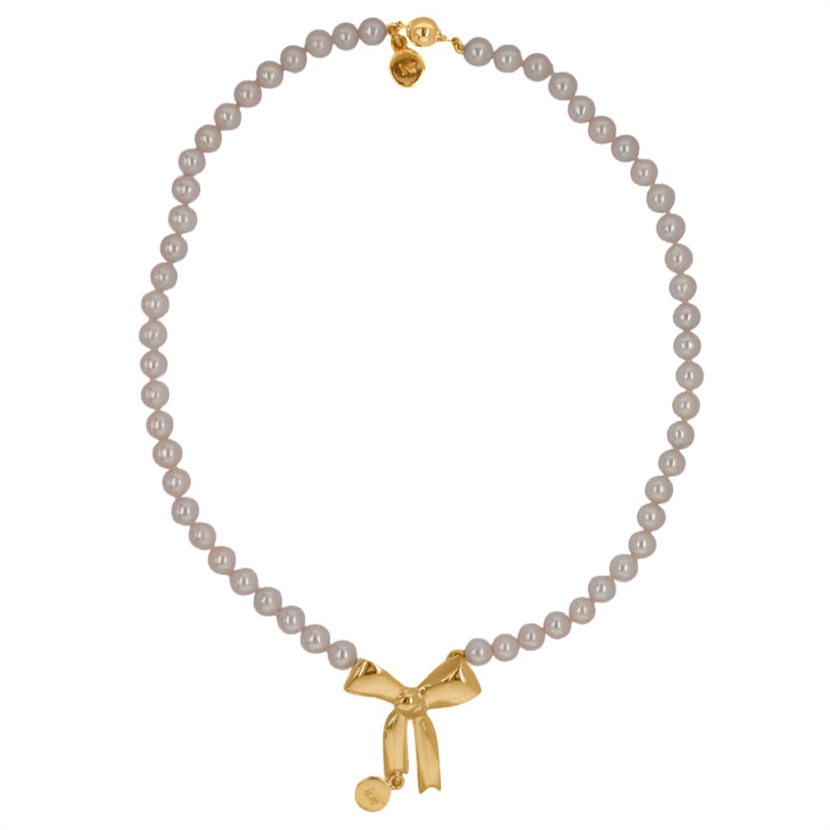 A whimsical strand of pearls anchors the classic Karen Walker bow in this ornate design.
