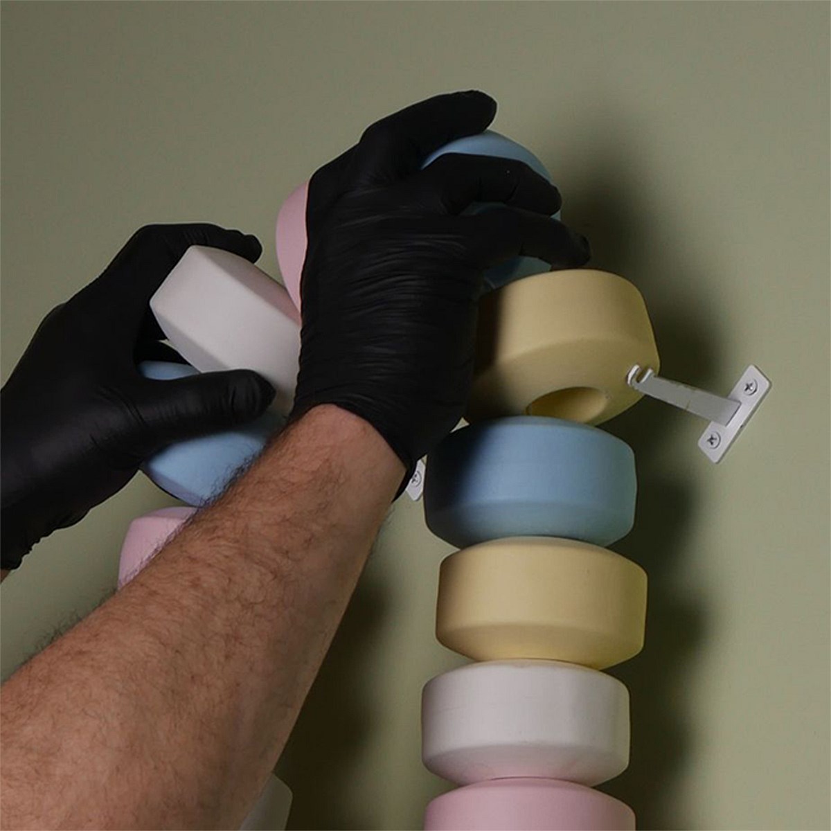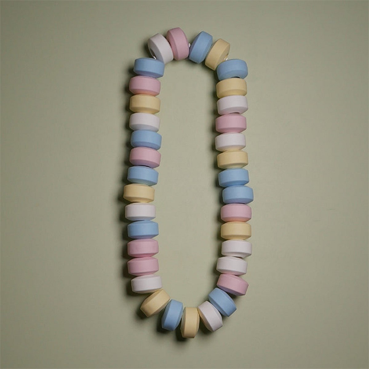 Remember nibbling one of these when the teacher's back was turned? The Candy Necklace is a super-sized throwback for those of you who liked to wear your lollies. Each chalky pastel bead is individually slip-cast in pigmented porcelain, strung on to a reinforced white-coated steel wire. Designed to hang on your wall (not your neck), it comes with a powder coated custom hanging system and an easy-to-follow template so you can get the spacing just right. Signed & numbered edition, edition number and signature are marked by hand into the back of one bead before kiln firing.
