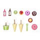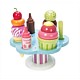 A fabulous painted wooden ice-cream set; Featuring three 'ice-creams' with interchangeable toppings, two sauce bottles and a spoon. The set includes the handy stand.