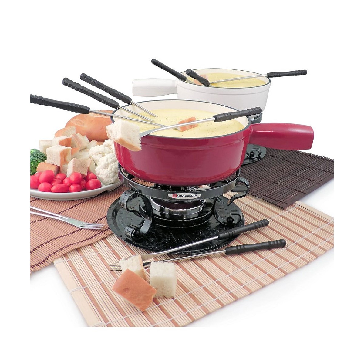 A must-have showcase piece, featuring an authentic Swiss fondue set for an authentic Swiss tradition. The ceramic pot is safe for use on the cooktop, in the oven, in the microwave, and with traditional fondue-fuelled burners.