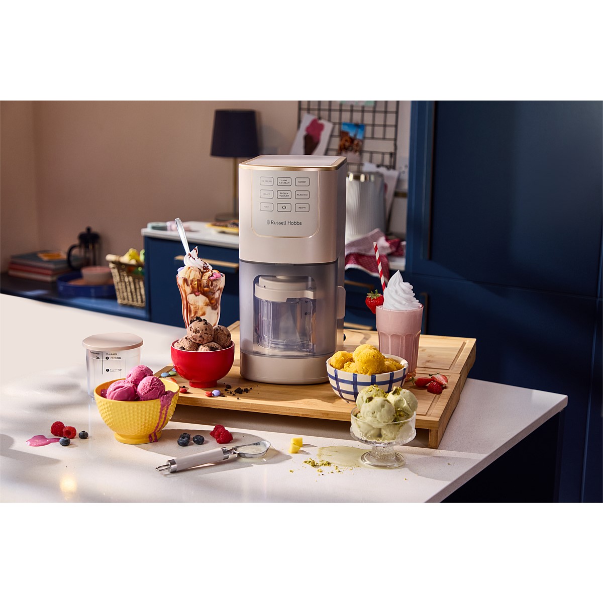 7 auto-functions: Ice Cream, Light Ice Cream, Sorbet, Milkshake, Gelato, Frozen Yoghurt, Mix-In (‘Mix-in’ is for adding toppings in).