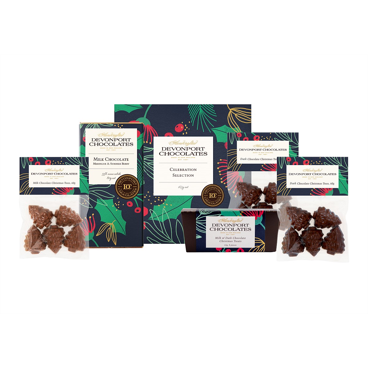 The Devonport Chocolates Christmas Luxury is the ultimate in Christmas luxury. A selection of delicious handmade Christmas treats including twelve creamy chocolates, milk and dark chocolate shapes, Christmas Berry Meringue chocolate bar, and milk and dark chocolate Christmas trees. A perfect gift for your loved ones!