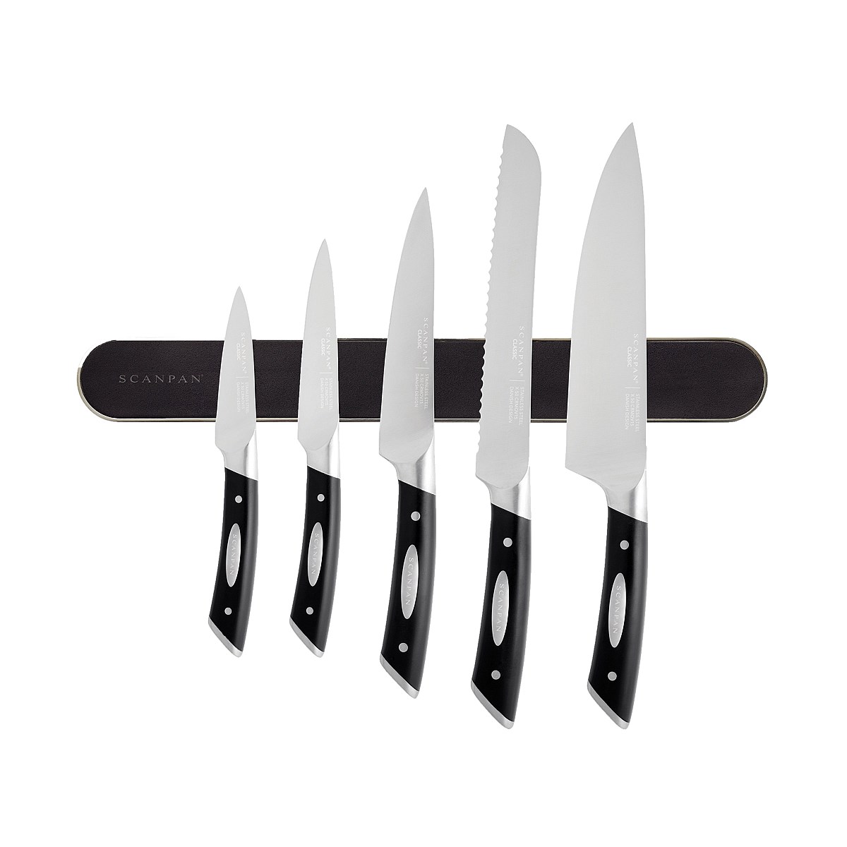 This Scanpan Classic 6 piece magnetic rack set is perfect for people with minimal bench space who want to store their knives in a professional and safe way. The set includes a 9cm paring knife, 11.5cm vegetable knife, 15cm utility knife, 20cm bread knife, 20cm cook's knife and 38.5cm magnetic bar. All Scanpan knives are guaranteed against manufacturing faults and defects for 10 years.