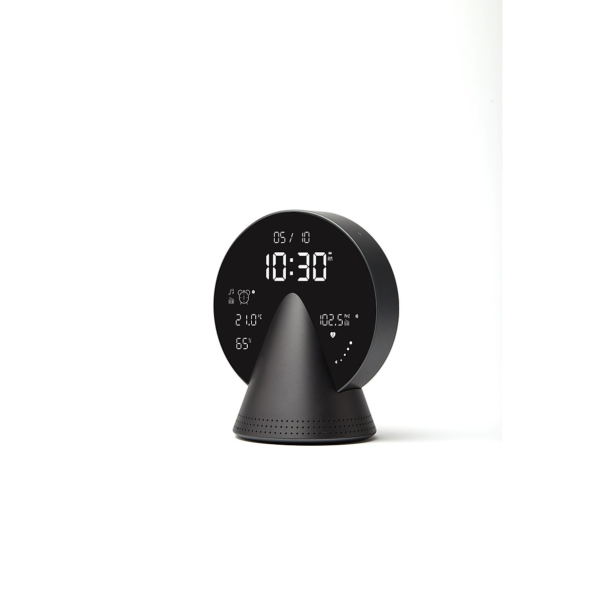 Conic Clock is more than just an alarm clock - its sleek, aluminum cone-shaped base and circular speaker make it a