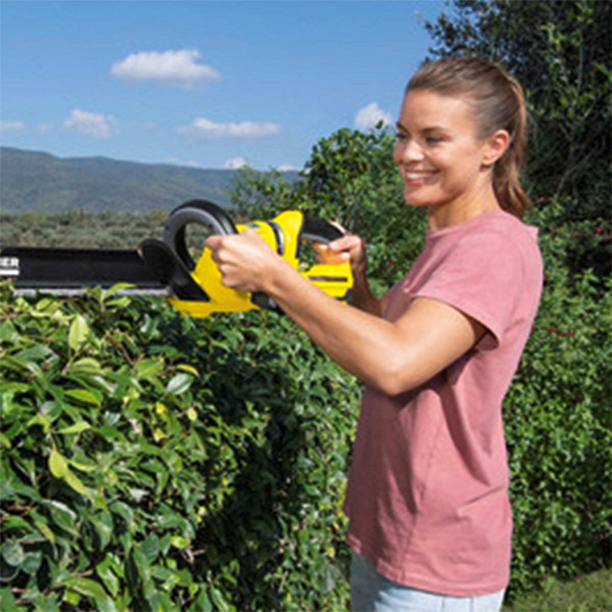 Fitted with a 180° rotating handle and a practical cuttings sweeper: the HGE 18-50 Battery powered hedge trimmer makes working convenient, safe and precise.