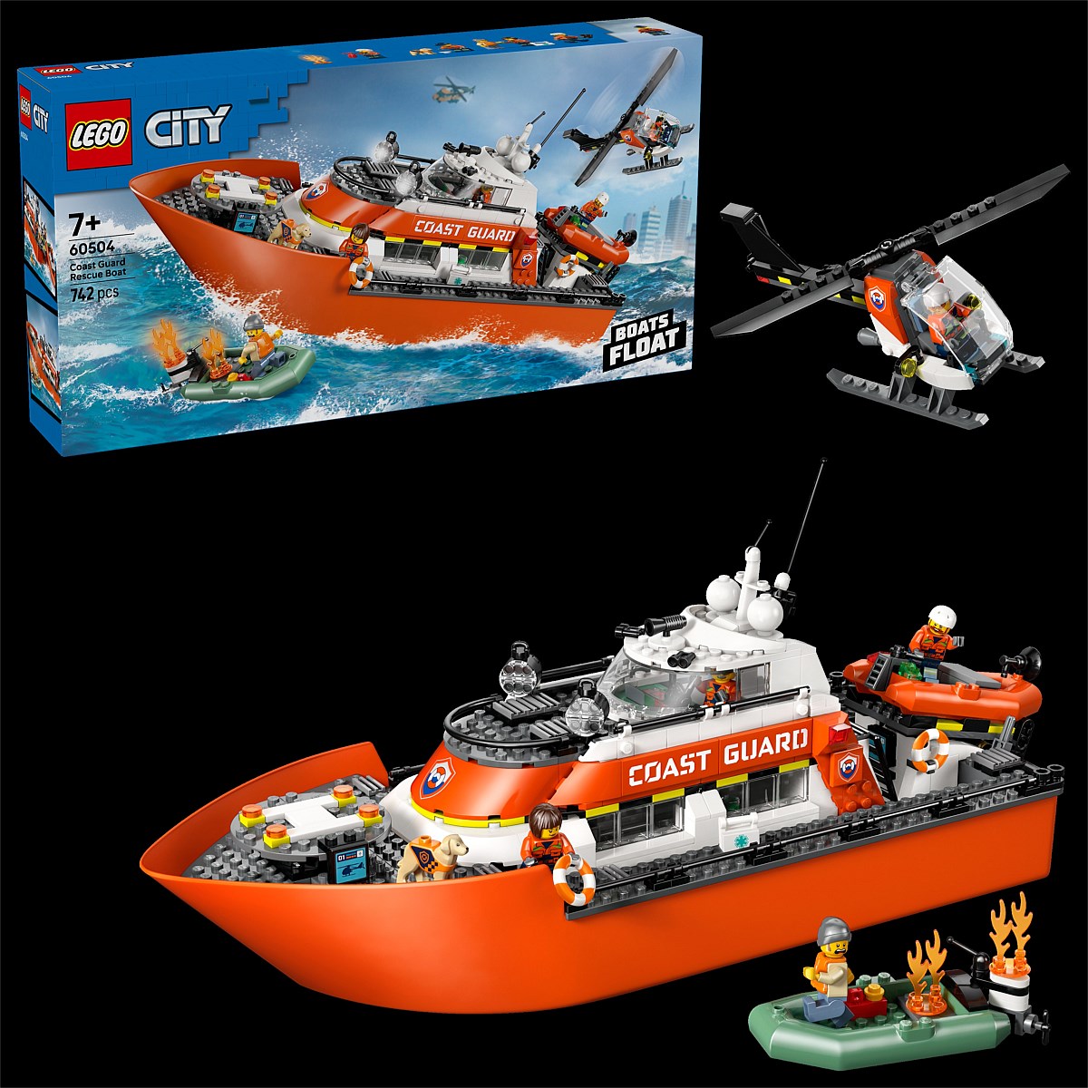 Kids ages 7+ can set out on ocean adventures with the LEGO® City Coast Guard Rescue Boat & Helicopter (60504) pretend play toy. This feature-packed floating boat with removable deck layers allows easy access for play in the ship's control bridge, sleeping quarters and kitchen. Kids can deploy a rescue dinghy from the launch ramp or take to the skies from the onboard helipad in a cool helicopter. The set also includes a second dinghy, LEGO flames, 5 minifigures and a dog figure for imaginative play and storytelling. All 3 boats float on water. This search-and-rescue emergency vehicles toy playset makes a great surprise treat or birthday gift for boys and girls who love hands-on interactive play. Add this set to others (sold separately) from the LEGO City range for more exciting adventures. With this pretend play building set, kids can enjoy intuitive building with the LEGO Builder app, zooming and rotating with 3D instructions, while saving and tracking progress. Set contains 742 pieces.