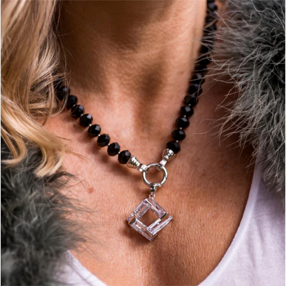 This gorgeous pendant from Kagi is the epitome of Luxury. Match with your Kagi Jet Black Necklace, Helix or Steel Me chains for a divine look! This is a stand-out piece! A unique design by Kagi. Stone: faceted crystal, emerald cut Size 30mm