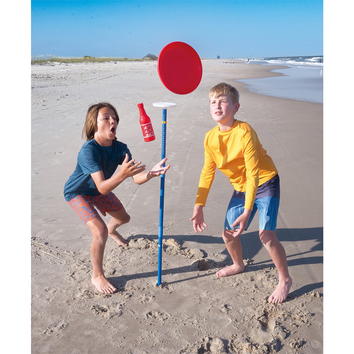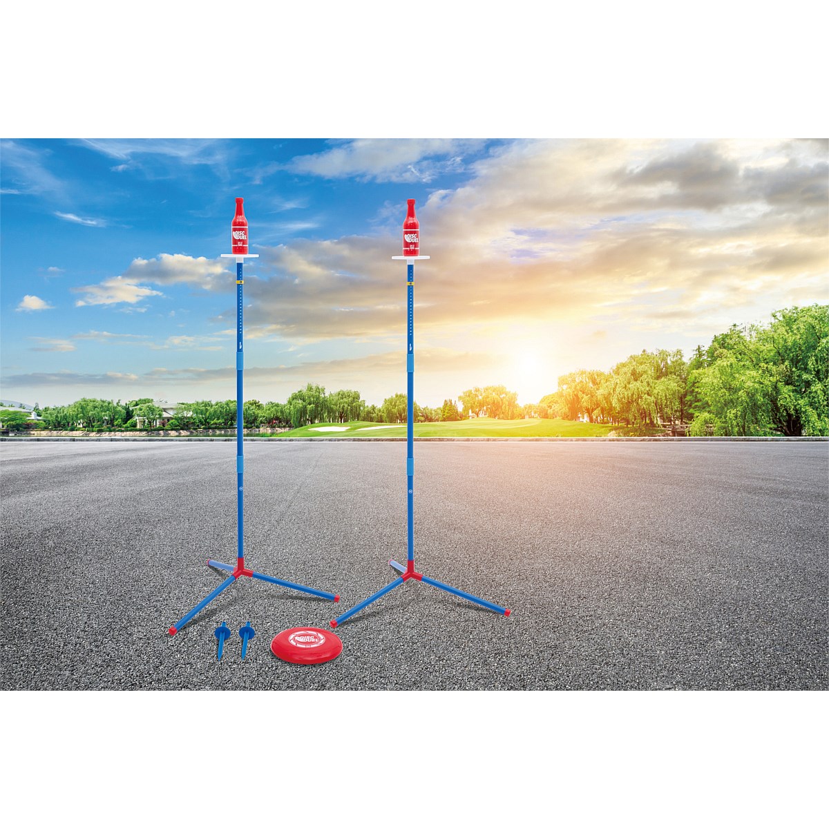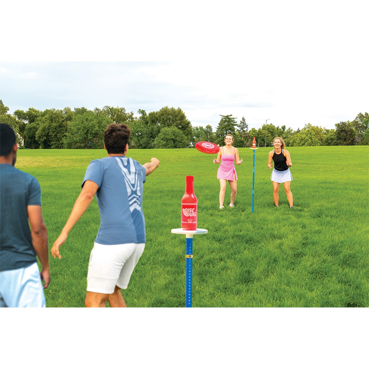 Toss, score, and compete with friends in this ultimate backyard challenge of battling discs! Throw the flying disc at your opponentsu2019 Bottle Target from a distance of up to 30ft (9m). The game tests reflexes as the defending team tries to catch the disc and bottle before they hit the ground. For young or new players, place the poles around 20 ft (6 m) apart.DUELING BACKYARD FUN!: Sharpen your reflexes and take aim at your opponents Bottle and Pole. Each successful throw racks up points, but watch out the defending team is on high alert. Their quick reflexes can intercept the disc and bottle, thwarting your scoring attempts.ALL-SURFACE PLAY: Enjoy Disc Duel anywhere thanks to the 2 included base styles tripod stand for hard surfaces at tailgates, driveways, or indoor gym spaces, and grounds spikes for backyard gatherings, camping adventures and beach outings.SUMMER SHOWDOWN: Gather your crew, friends, parents or family members for the ultimate backyard game. Whether you have 2 to 4 people, let the duel begin!EFFORTLESS SETUP: Get into the game quickly with a setup and pack-up process thats a breeze, taking less than 60 secondsnADJUSTABLE PLAY AREA: Tailor the games difficulty with a court ranging from 20 to 30 feet, suitable for various skill levels.COMPLETE DISC DUEL SET: This set includes 1 throwing isc, 2 bottles with caps, 2 target poles with score sliders, 2 ground spike attachments, 2 tripod stands, and 1 carry bag.