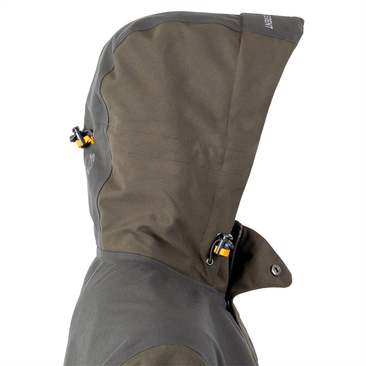 The Downpour Elite Jacket is a do-it-all, workhorse waterproof and breathable hunting jacket. It's quiet, lightweight and packs down tight and disappears in the bottom of a backpack making it the perfect deerstalker or waterfowl coat. It has two lower billowed pockets that can handle a couple of boxes of 12g cartridges and a hidden chest pocket to handle callers or cell phones. This thing is the perfect all-around hunting jacket that can't be beaten on price. It looks good, it's quiet, it breathes, it has all the features and most importantly it's super waterproof.