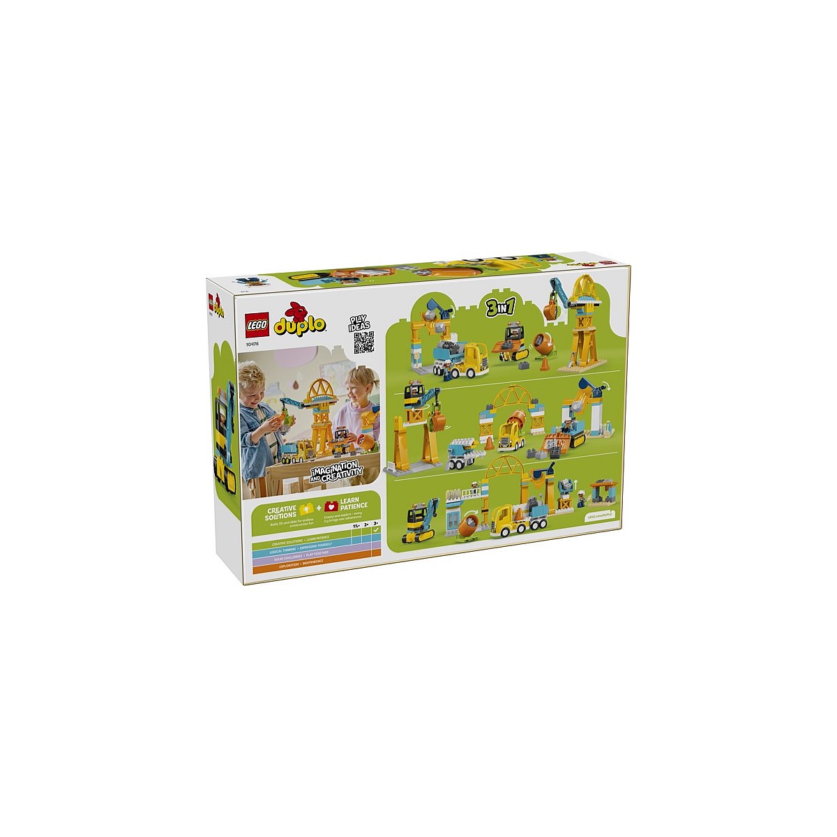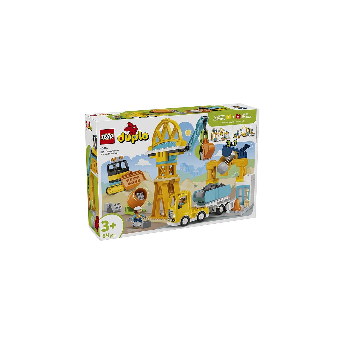 Introduce little builders to the 3 in 1 Construction Site and Vehicles (10476) toy where the building never stops! Toddlers ages 3+ immerse themselves in busy construction play as they load and unload the trucks, and pick up and move the boulders and the bricks with a range of LEGO® DUPLO® construction trucks. Toddlers can build a bulldozer with a lifting bucket, a dump truck toy with a tipping action, a cement mixer with a rotating drum and the crane's movable arm has a hinged bucket. The bricks also can be assembled to make a tall crane, a loading station the trucks can rumble through and a bridge the vehicles can drive under. Through endless fun-filled play, toddlers can learn valuable early skills. For kids who love problem-solving, they'll deploy critical thinking while working out how to construct the toy buildings. They can develop their spatial awareness as they get 2 worker figures to move the bricks around the building site using the truck's fun features. Contains 84 pieces.