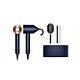Style your hair quickly and gently with the Dyson Supersonic Hair Dryer in Prussian Blue. This smart dryer protects your hair's natural shine by measuring temperature over 40 times per second to prevent heat damage. The powerful digital motor spins at up to 110,000rpm, while Air Multiplie technology creates a controlled jet of air for fast drying and precise styling. Choose from 4 heat settings (including a cold shot) and 3 speed options to suit your hair type. It comes with three attachments - a styling concentrator, gentle air attachment, and flyaway attachment - perfect for straight and wavy hair. Backed by a 2 year warranty. Model number: 113297-01.
