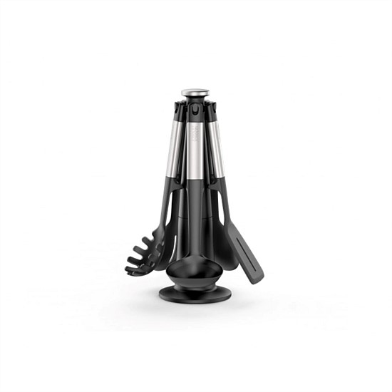 Elevate utensils have been designed to improve hygiene and minimise the mess made by placing utensils onto kitchen surfaces during use. Each tool has a weighted handle with an integrated tool rest that prevents the head from touching the work surface when placed down. This smart 5-piece set features utensils with heat-resistant silicone tool heads and sleek stainless-steel handles, plus a rotating storage stand with a non-slip base for easy tool selection. The heads are heat-resistant up to 210 degrees and suitable for use with all types of cookware, including non-stick. The set includes five essential utensils including a solid spoon, slotted spoon, slotted turner, spaghetti claw and a ladle.