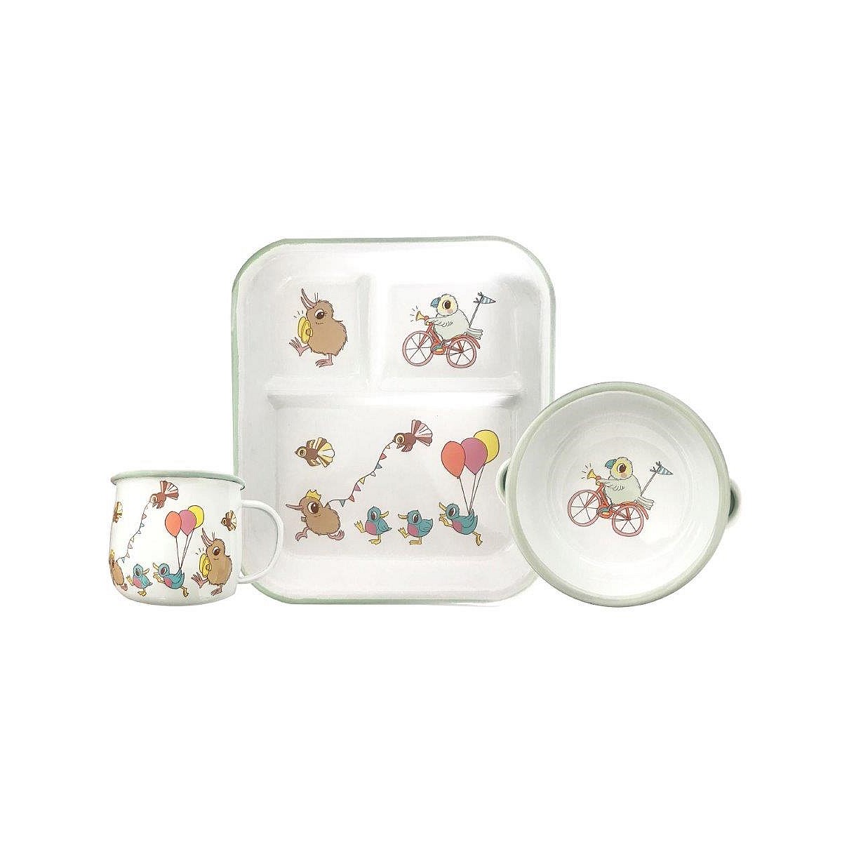 Latest range from best selling book character Kuwi the Kiwi, hard wearing enamel dinnerware set.