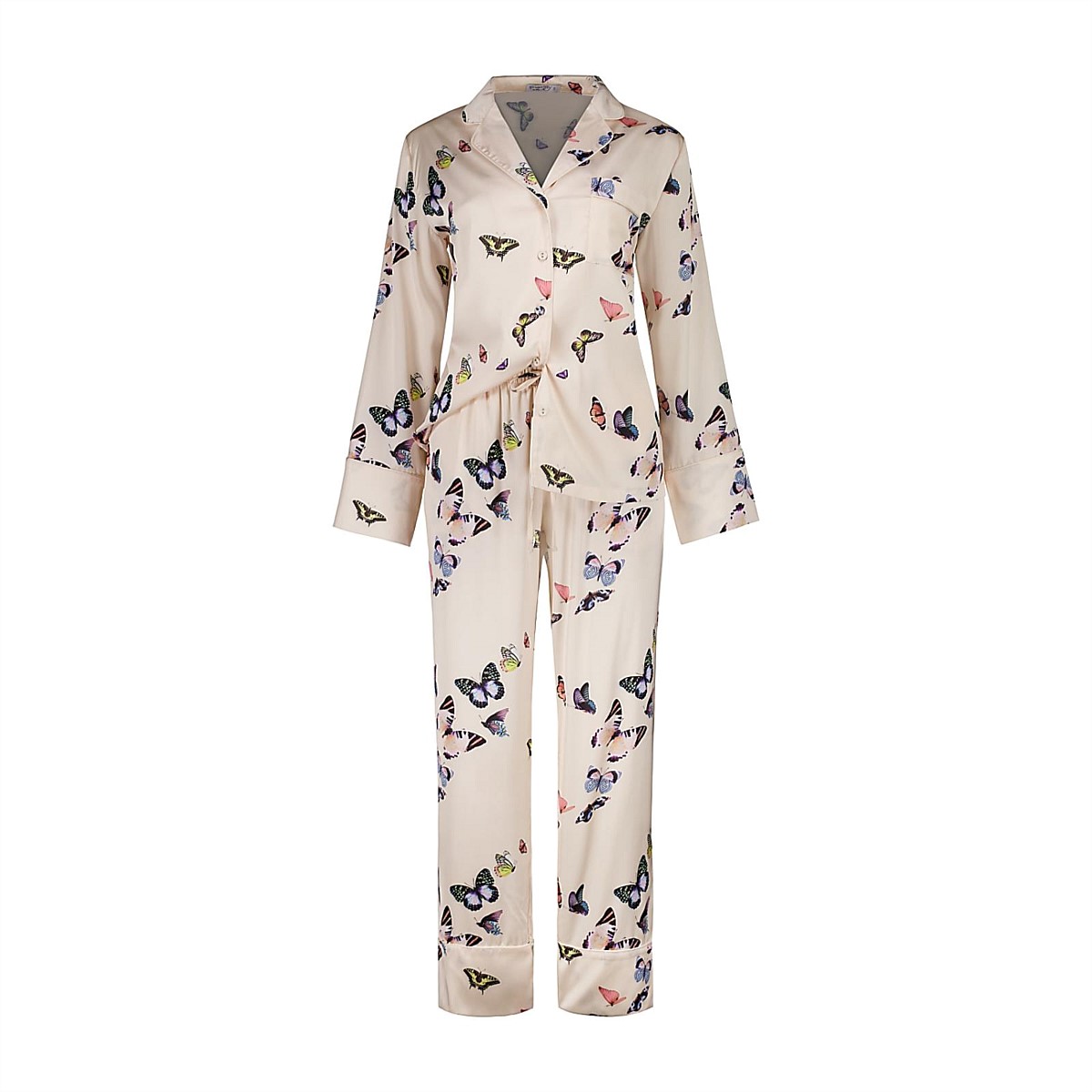 Estelle Butterfly Print Pyjama Set. Crafted from luxurious silky satin, this set offers a gentle touch against the skin.