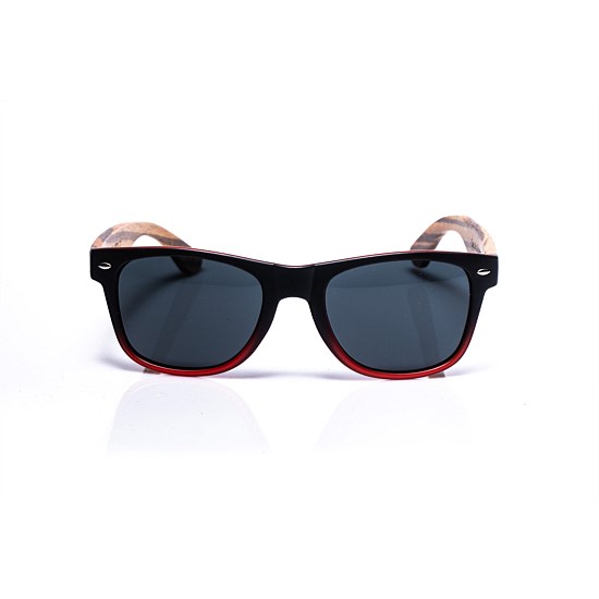 Polarised Wooden Arm Eyewear. Black and red Matte frame with sustainably harvested zebra wood arms. 3 barelled spring loaded hinges for comfort and durability. Polarised grey lens with UV400 protection. Includes: